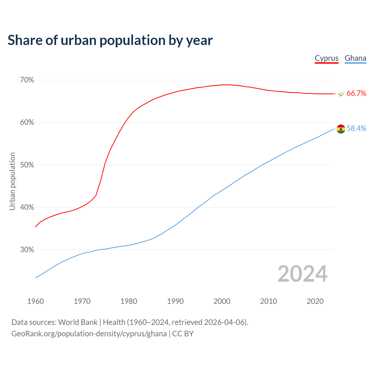 From 2004 to 2024, the share of urban population changed from 68.6% to 66.7% in Cyprus and from 46.8% to 58.4% in Ghana.