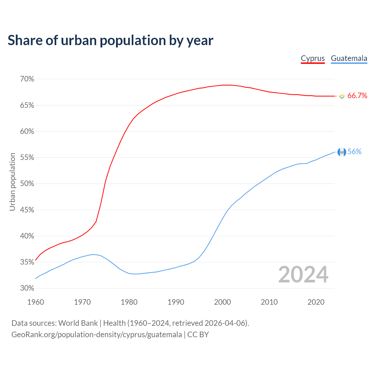 From 2004 to 2024, the share of urban population changed from 68.6% to 66.7% in Cyprus and from 47.3% to 56% in Guatemala.