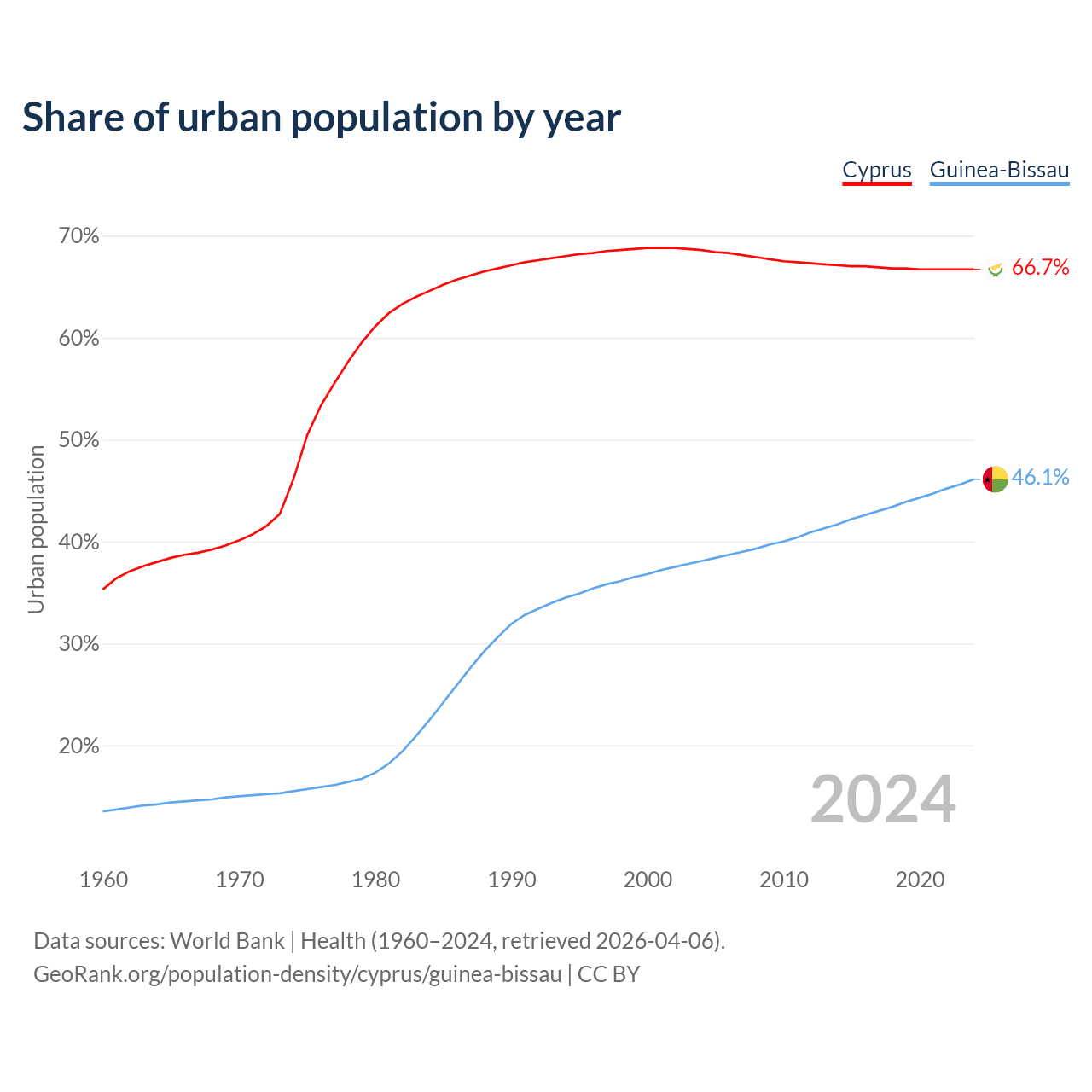 From 2004 to 2024, the share of urban population changed from 68.6% to 66.7% in Cyprus and from 38.1% to 46.1% in Guinea-Bissau.