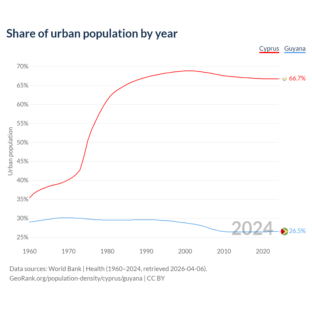 From 2004 to 2024, the share of urban population changed from 68.6% to 66.7% in Cyprus and from 28.1% to 26.5% in Guyana.