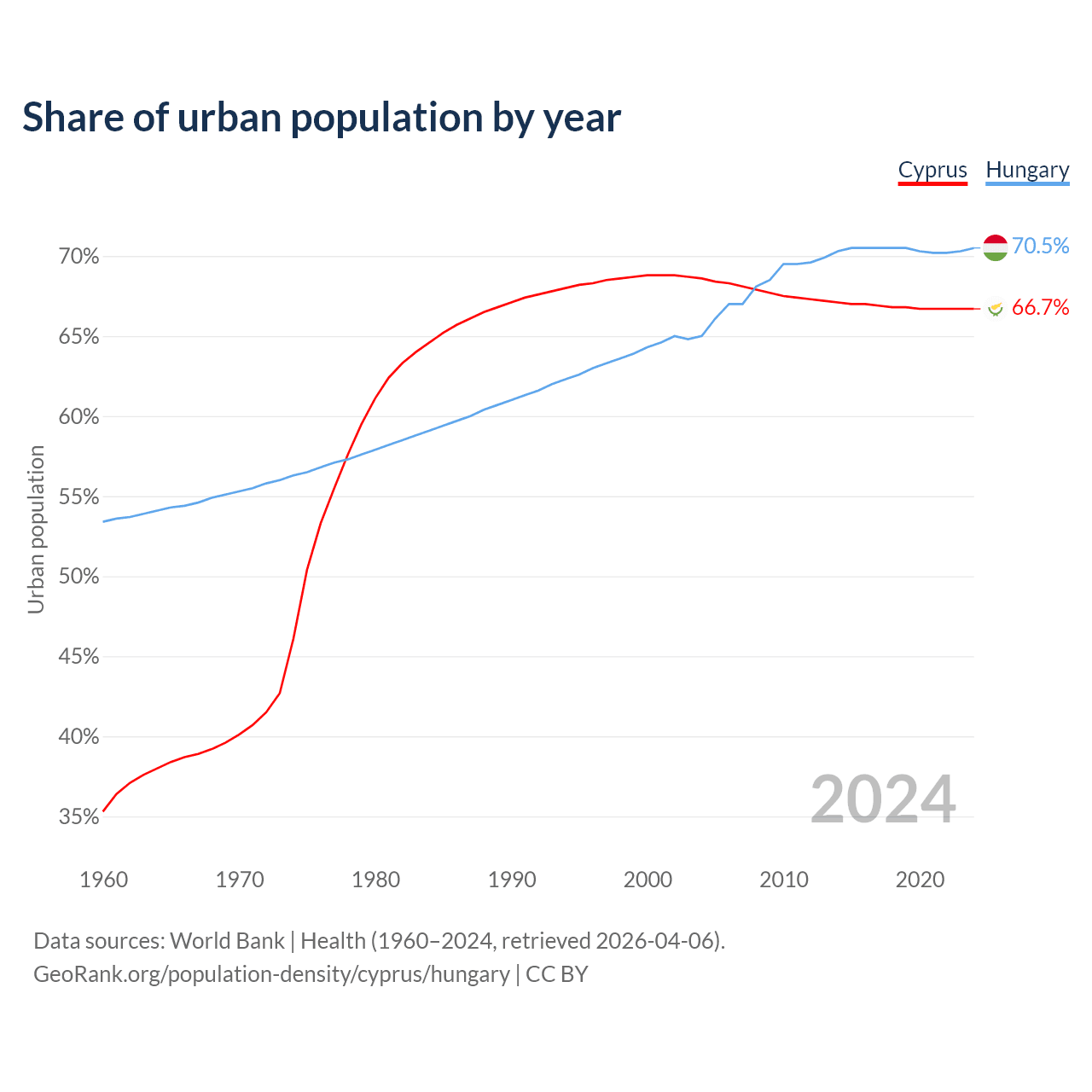 From 2004 to 2024, the share of urban population changed from 68.6% to 66.7% in Cyprus and from 65% to 70.5% in Hungary.