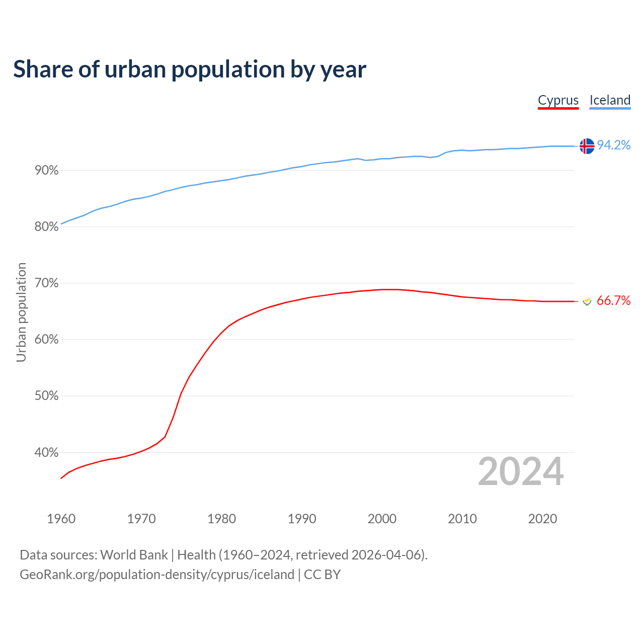 From 2004 to 2024, the share of urban population changed from 68.6% to 66.7% in Cyprus and from 92.4% to 94.2% in Iceland.