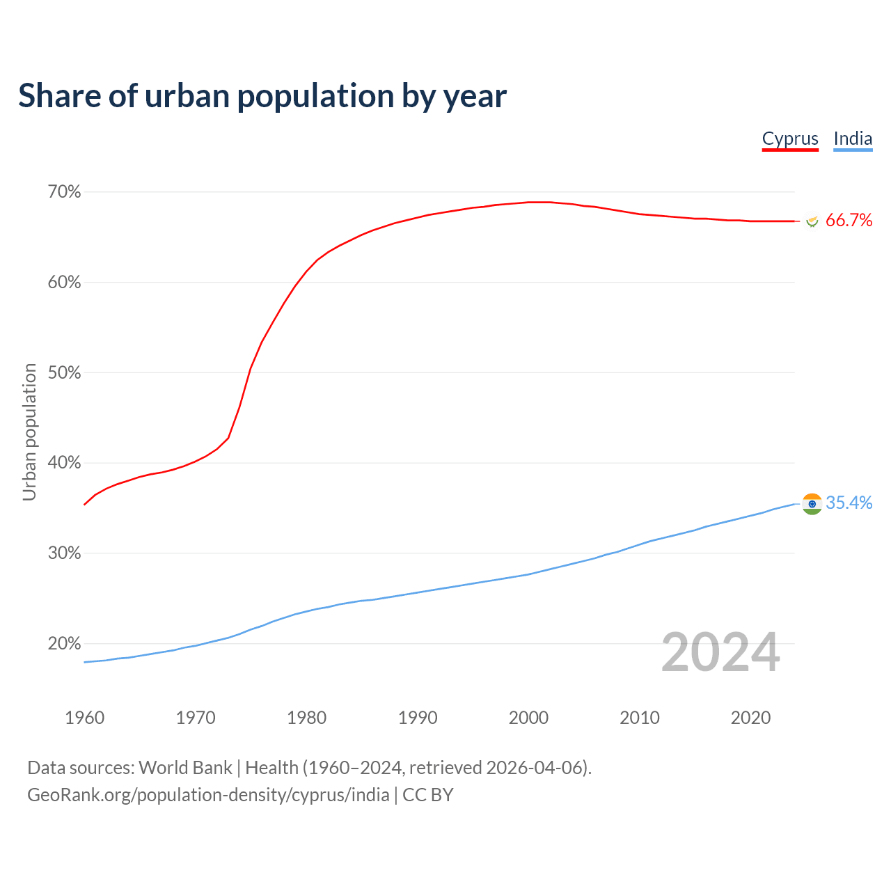 From 2004 to 2024, the share of urban population changed from 68.6% to 66.7% in Cyprus and from 28.8% to 35.4% in India.