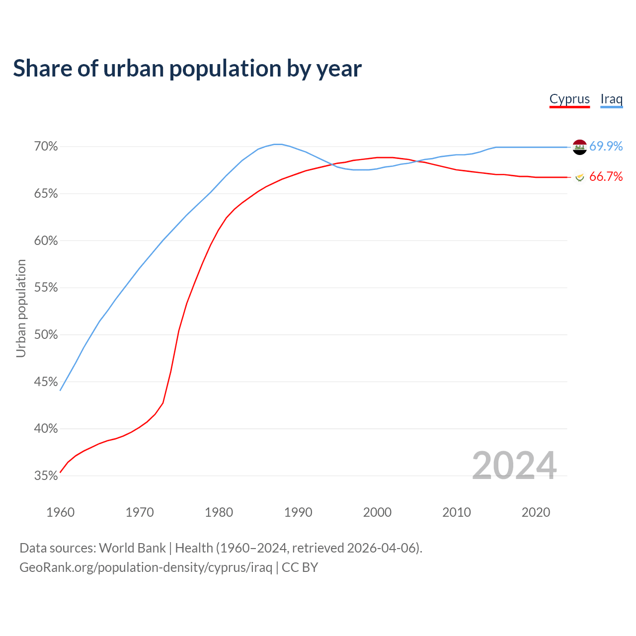 From 2004 to 2024, the share of urban population changed from 68.6% to 66.7% in Cyprus and from 68.2% to 69.9% in Iraq.