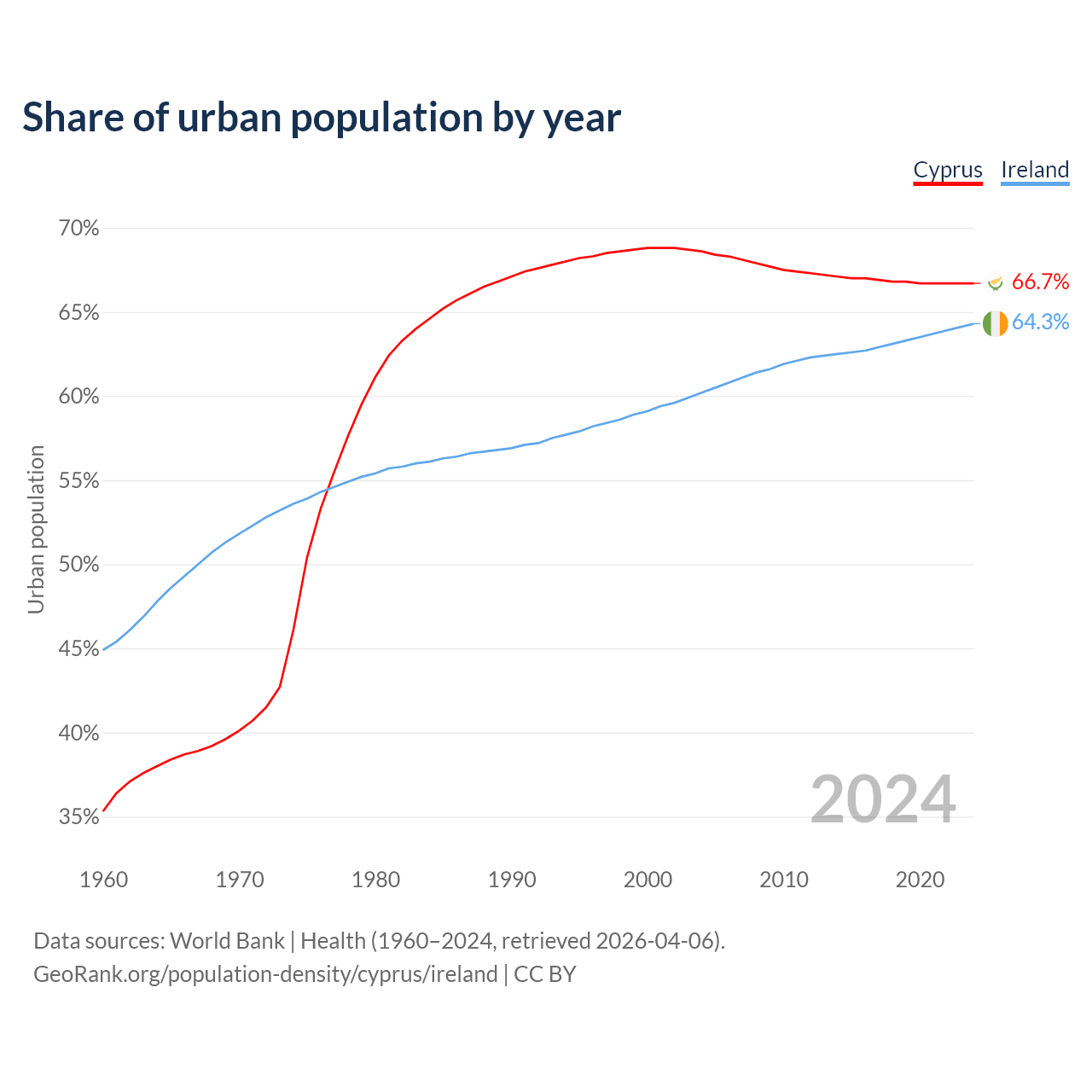 From 2004 to 2024, the share of urban population changed from 68.6% to 66.7% in Cyprus and from 60.2% to 64.3% in Ireland.