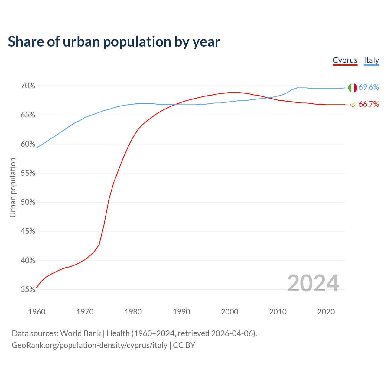 From 2004 to 2024, the share of urban population changed from 68.6% to 66.7% in Cyprus and from 67.5% to 69.6% in Italy.