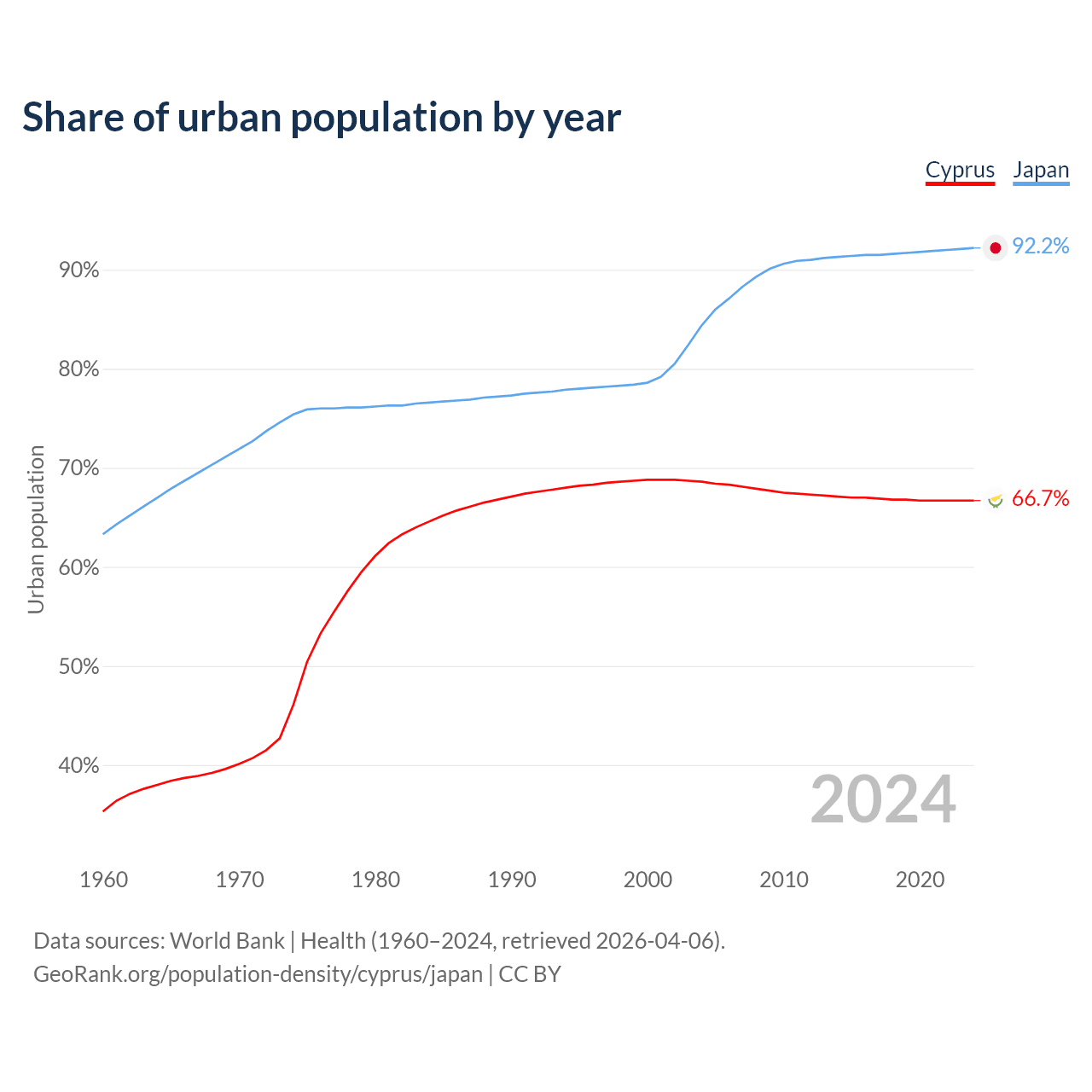 From 2004 to 2024, the share of urban population changed from 68.6% to 66.7% in Cyprus and from 84.4% to 92.2% in Japan.