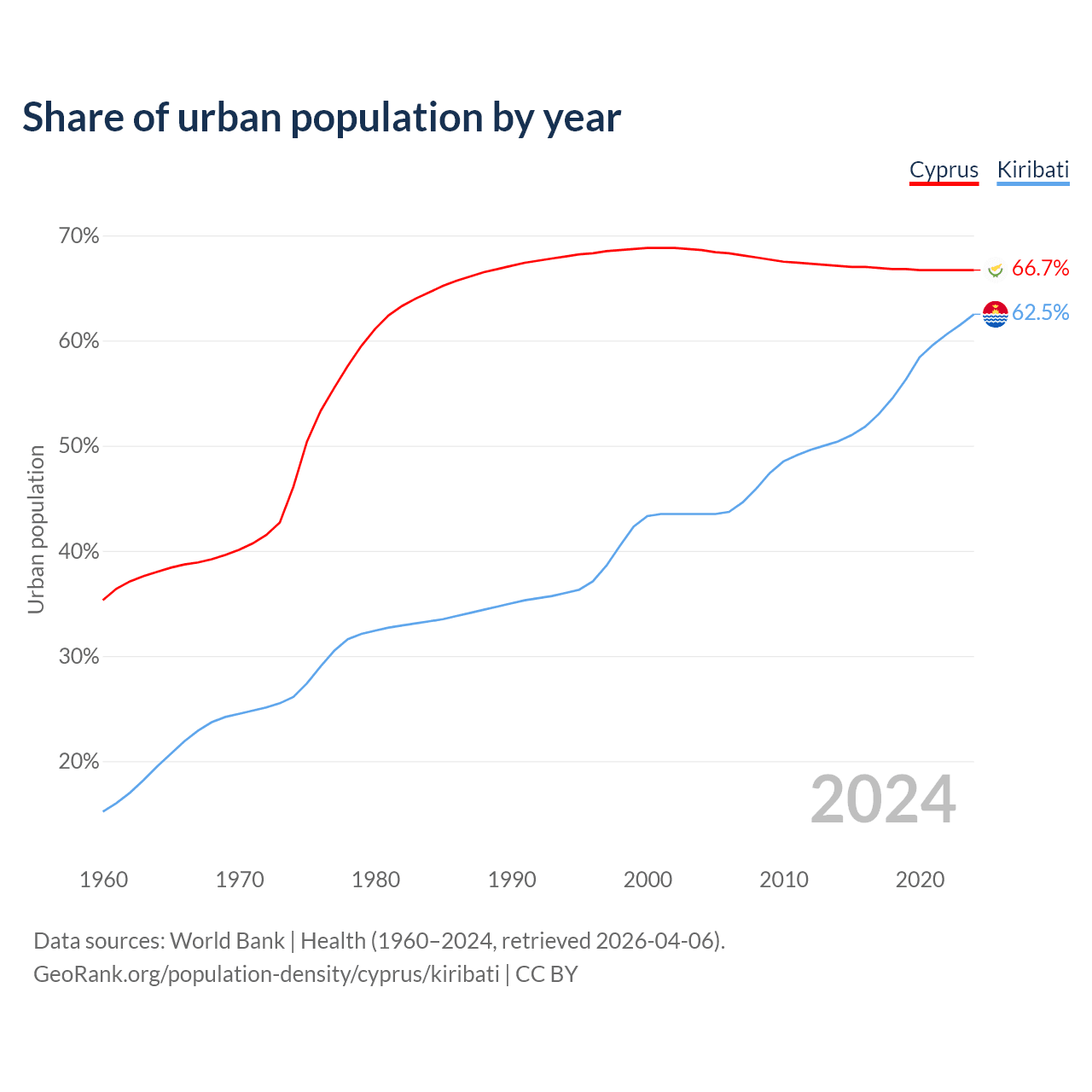 From 2004 to 2024, the share of urban population changed from 68.6% to 66.7% in Cyprus and from 43.5% to 62.5% in Kiribati.