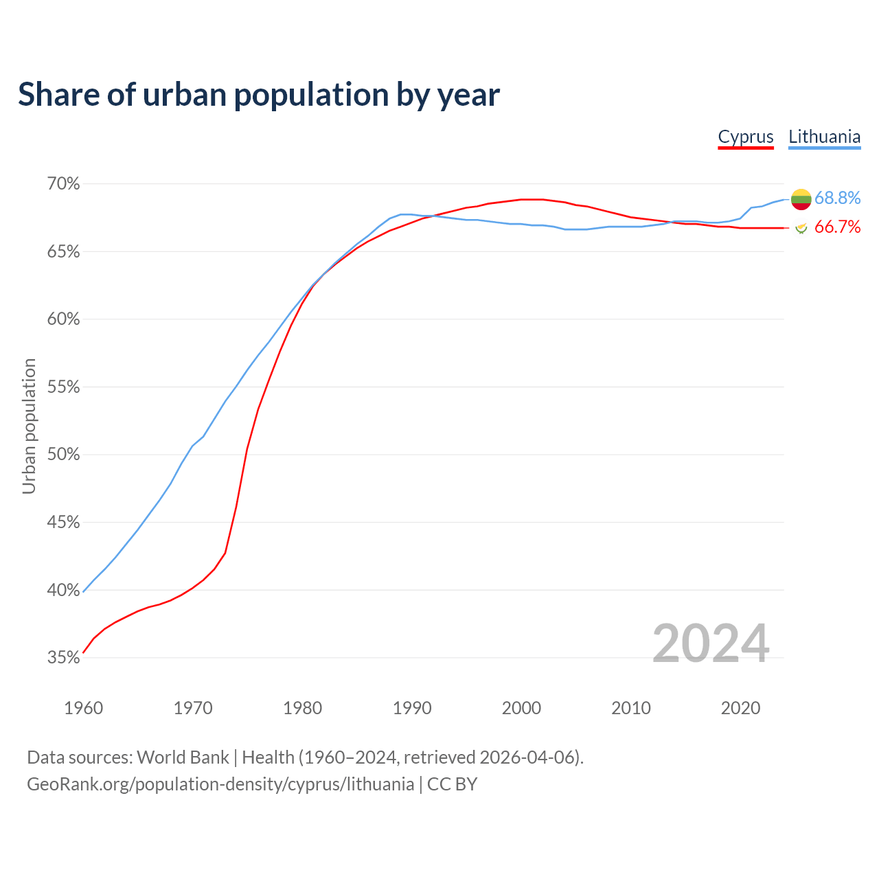 From 2004 to 2024, the share of urban population changed from 68.6% to 66.7% in Cyprus and from 66.6% to 68.8% in Lithuania.