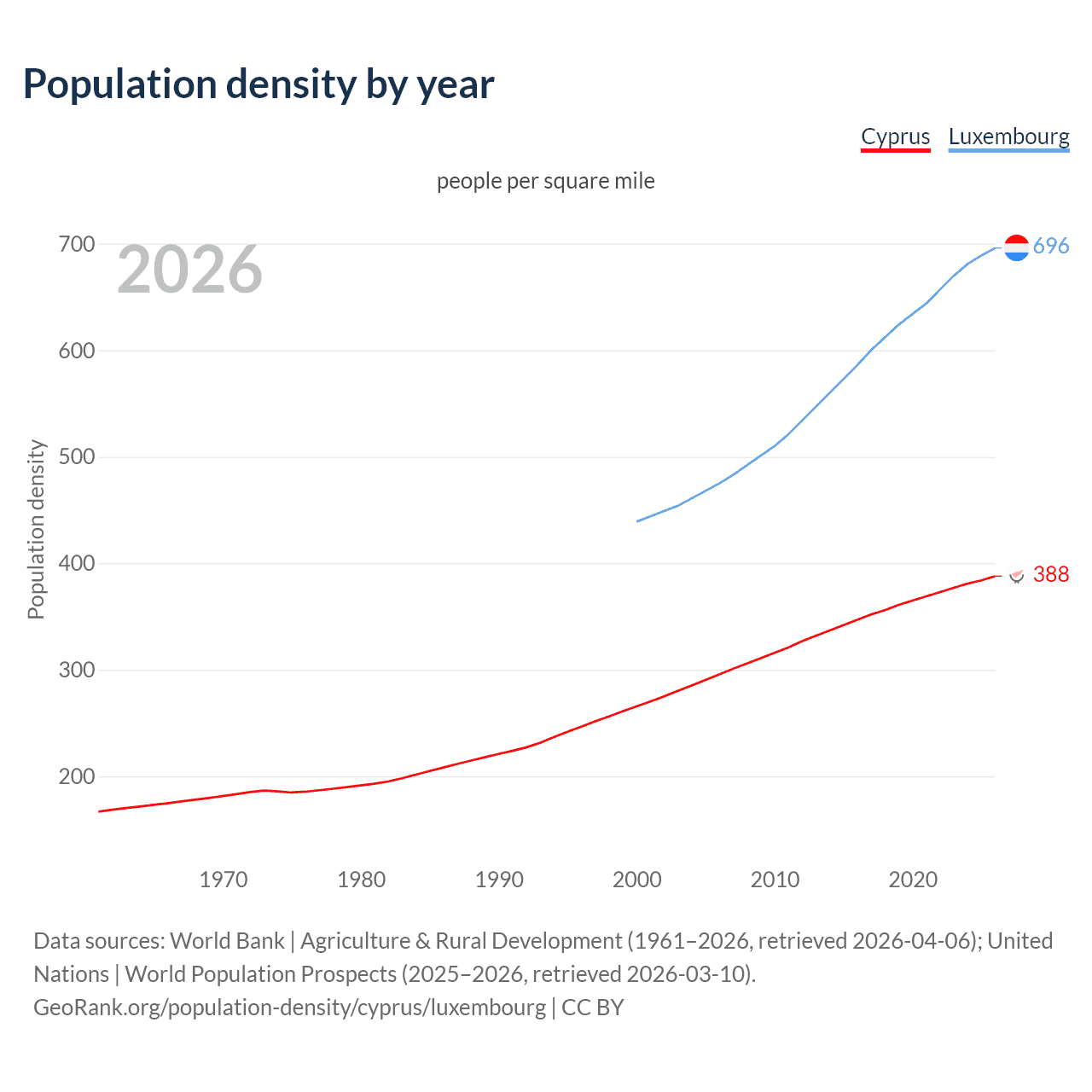 From 2006 to 2026, population density in Cyprus increased by 31.2%, compared to a 46.4% growth in Luxembourg.
