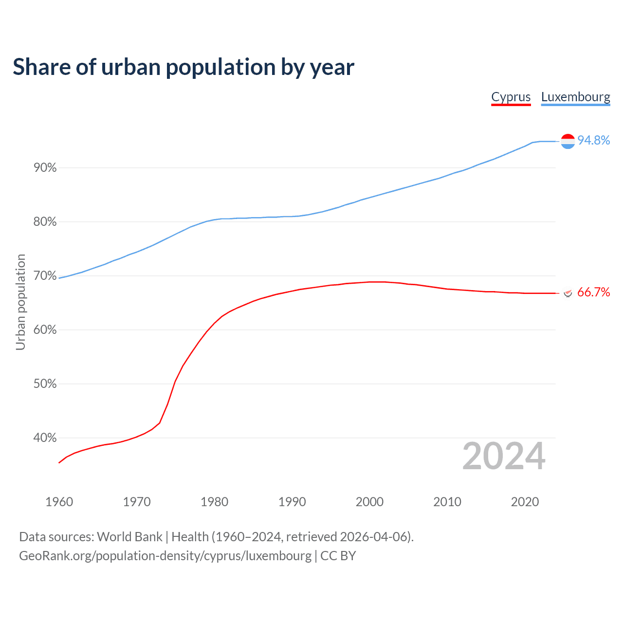 From 2004 to 2024, the share of urban population changed from 68.6% to 66.7% in Cyprus and from 86% to 94.8% in Luxembourg.