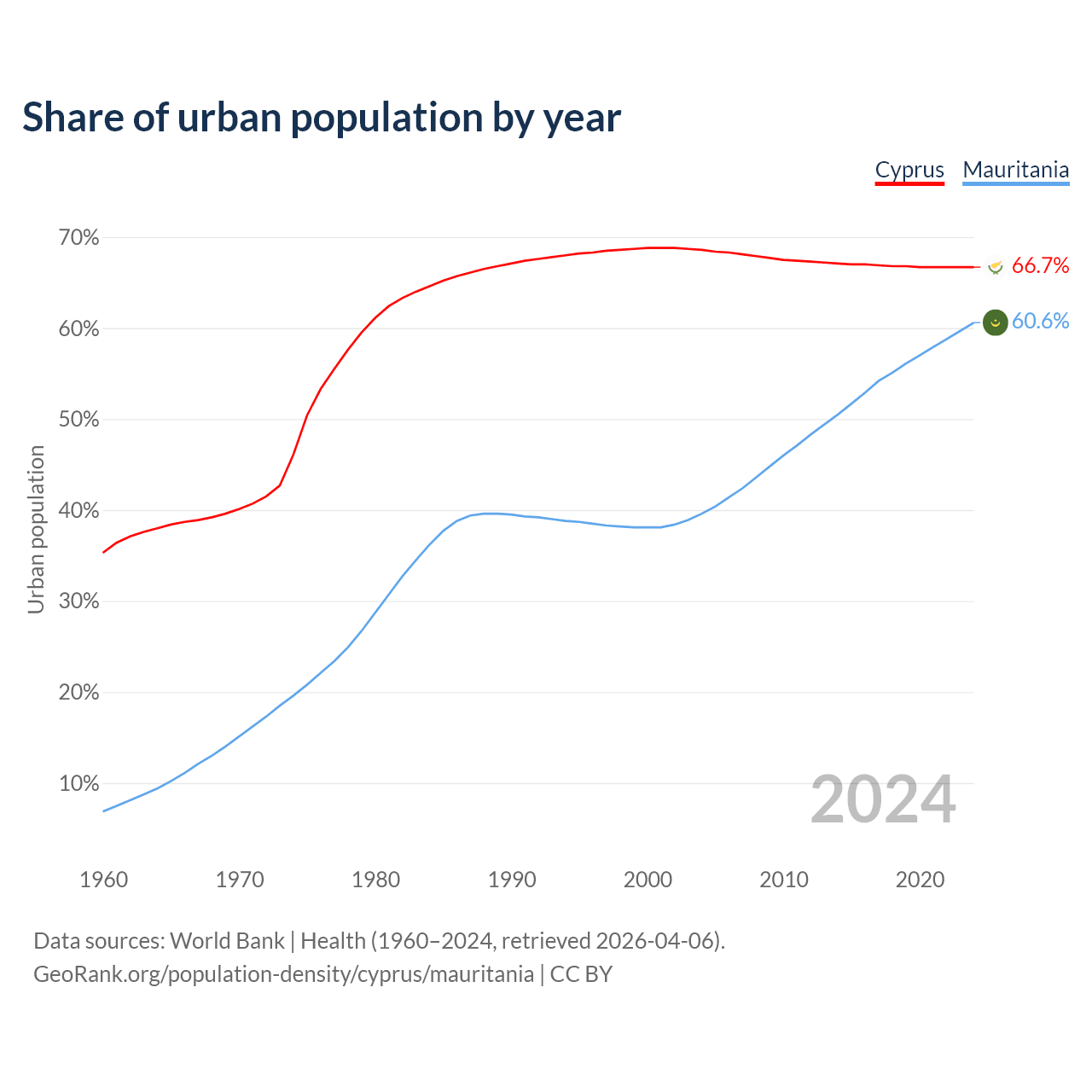 From 2004 to 2024, the share of urban population changed from 68.6% to 66.7% in Cyprus and from 39.6% to 60.6% in Mauritania.