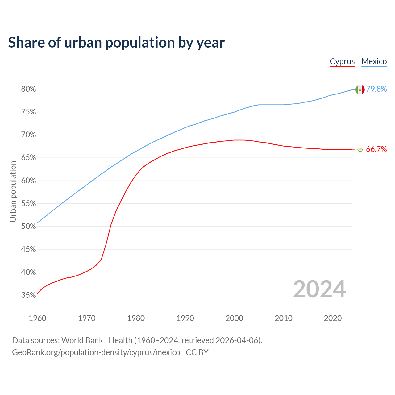 From 2004 to 2024, the share of urban population changed from 68.6% to 66.7% in Cyprus and from 76.3% to 79.8% in Mexico.