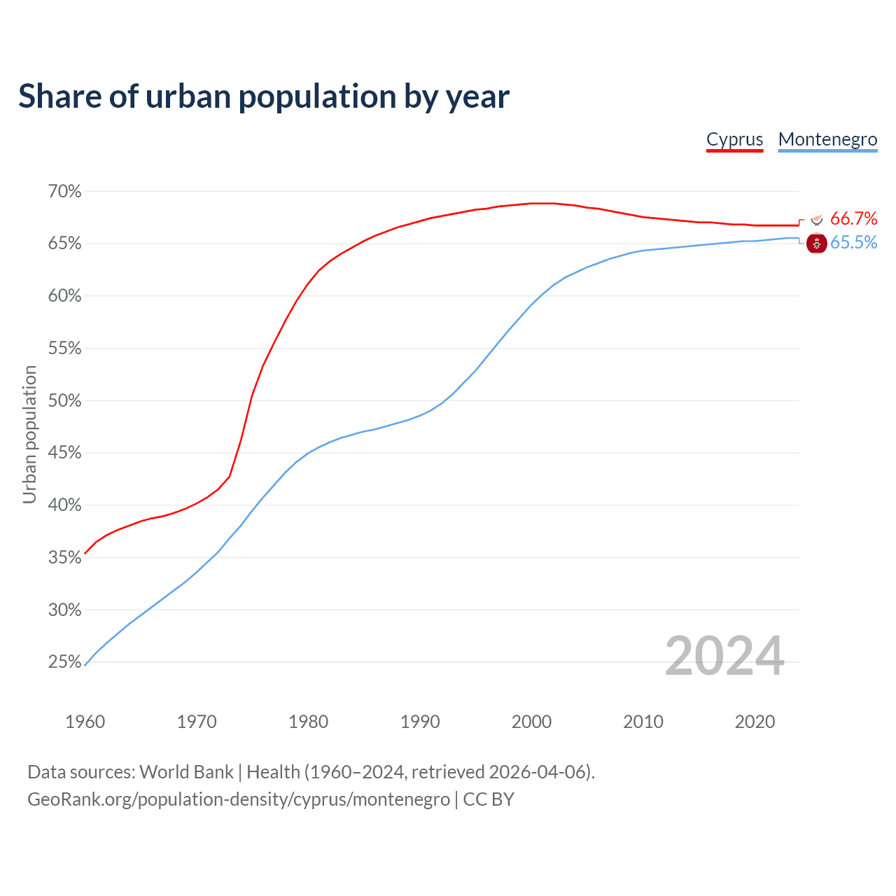 From 2004 to 2024, the share of urban population changed from 68.6% to 66.7% in Cyprus and from 62.2% to 65.5% in Montenegro.