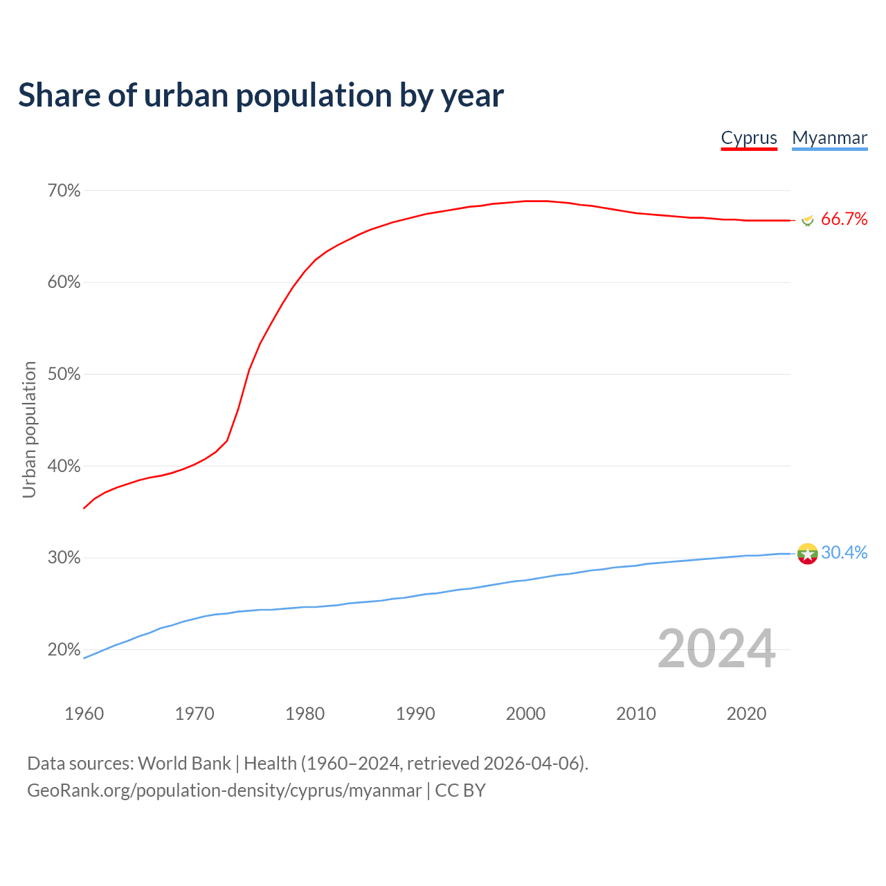 From 2004 to 2024, the share of urban population changed from 68.6% to 66.7% in Cyprus and from 28.2% to 30.4% in Myanmar.