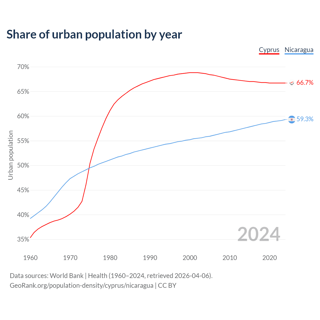 From 2004 to 2024, the share of urban population changed from 68.6% to 66.7% in Cyprus and from 55.8% to 59.3% in Nicaragua.