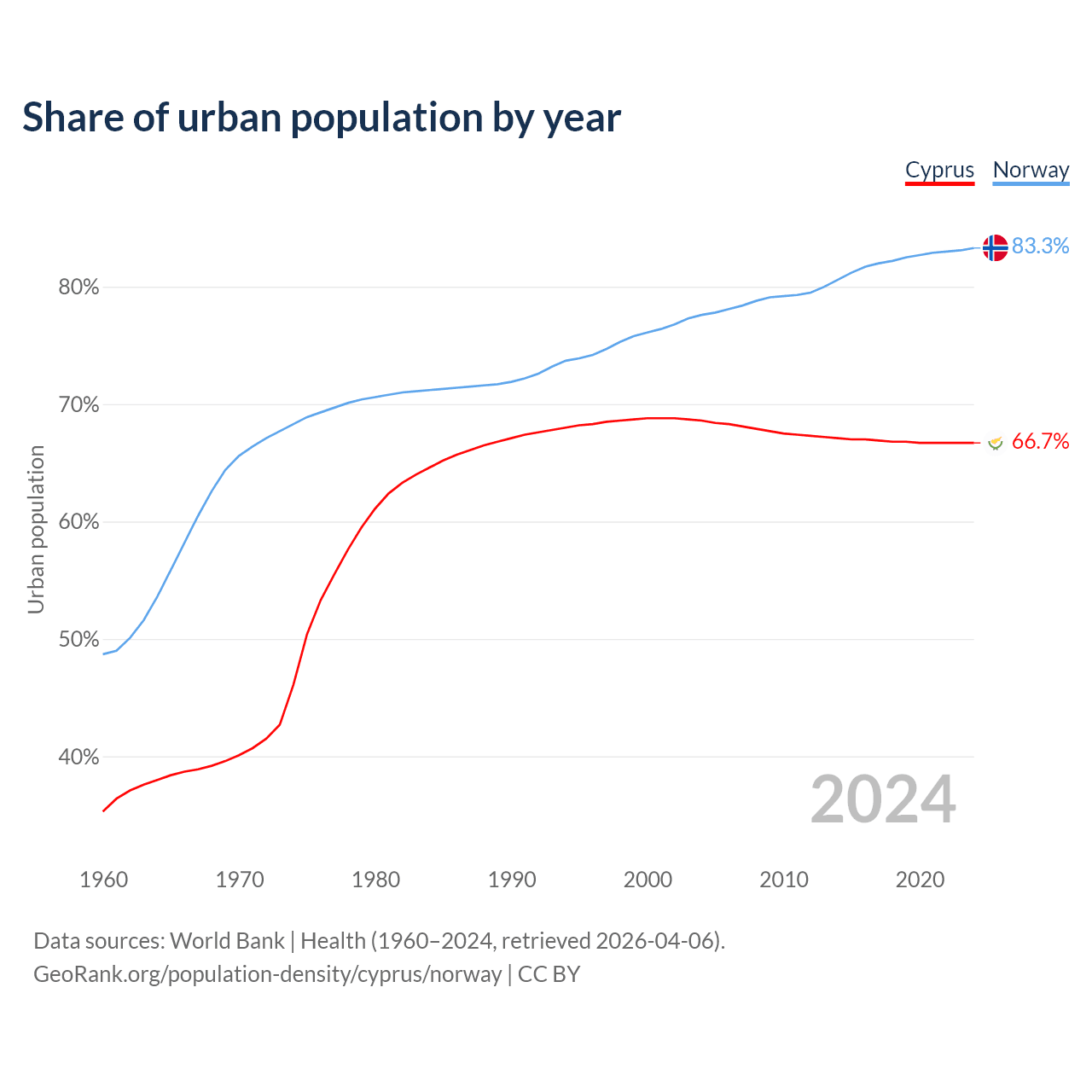 From 2004 to 2024, the share of urban population changed from 68.6% to 66.7% in Cyprus and from 77.6% to 83.3% in Norway.