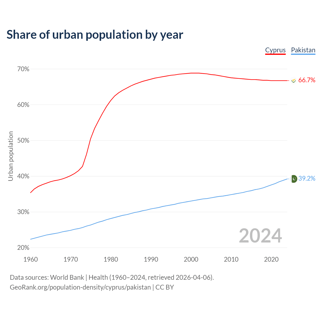 From 2004 to 2024, the share of urban population changed from 68.6% to 66.7% in Cyprus and from 33.7% to 39.2% in Pakistan.