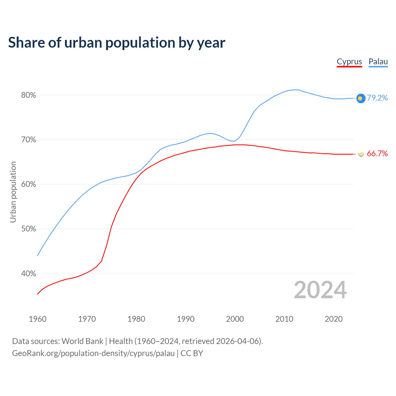 From 2004 to 2024, the share of urban population changed from 68.6% to 66.7% in Cyprus and from 76.4% to 79.2% in Palau.