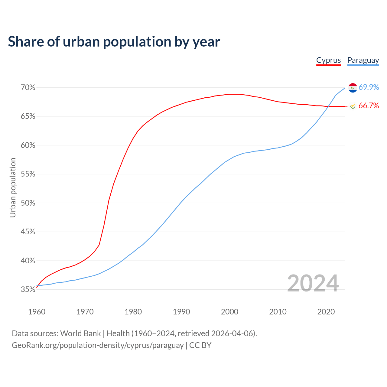 From 2004 to 2024, the share of urban population changed from 68.6% to 66.7% in Cyprus and from 58.7% to 69.9% in Paraguay.