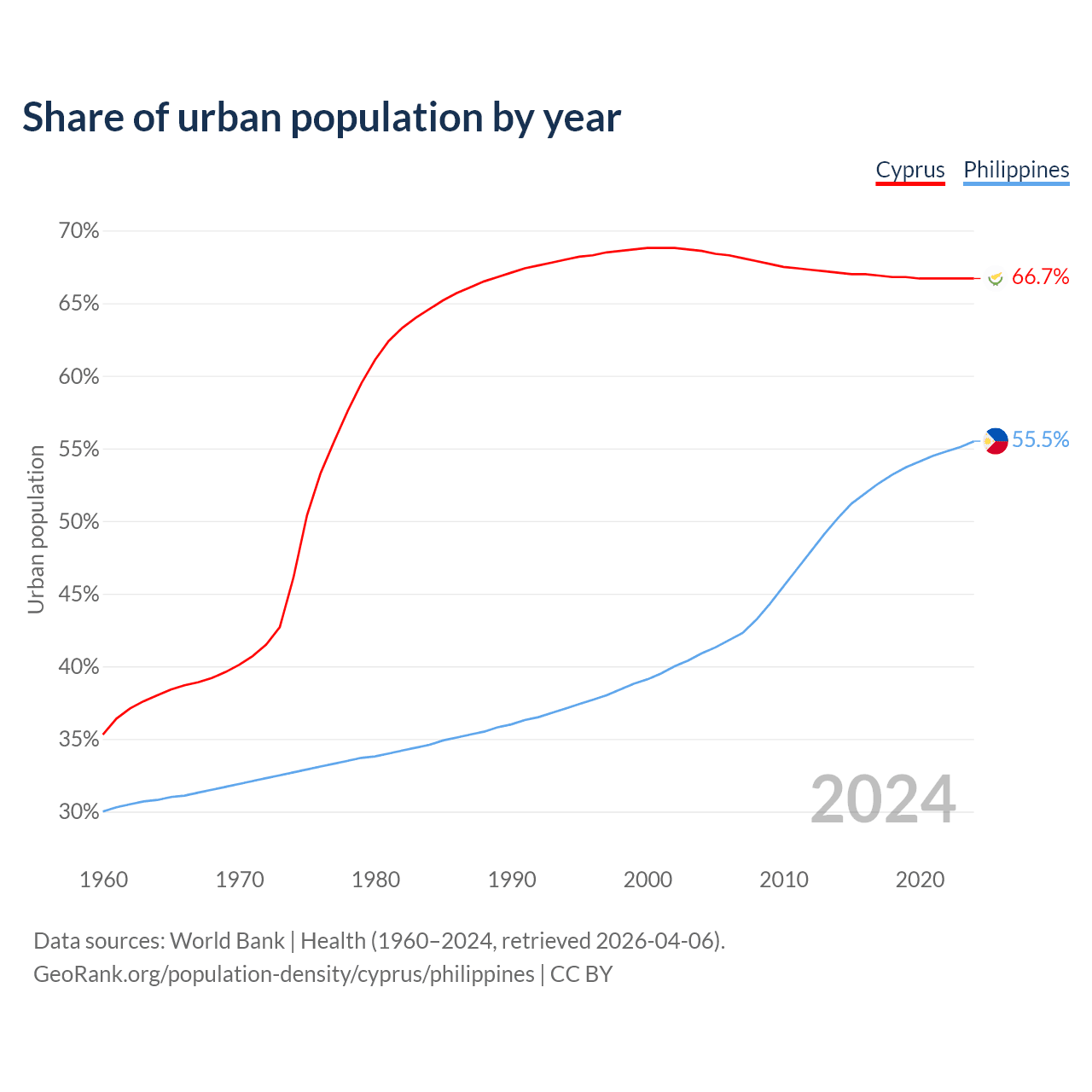 From 2004 to 2024, the share of urban population changed from 68.6% to 66.7% in Cyprus and from 40.9% to 55.5% in the Philippines.