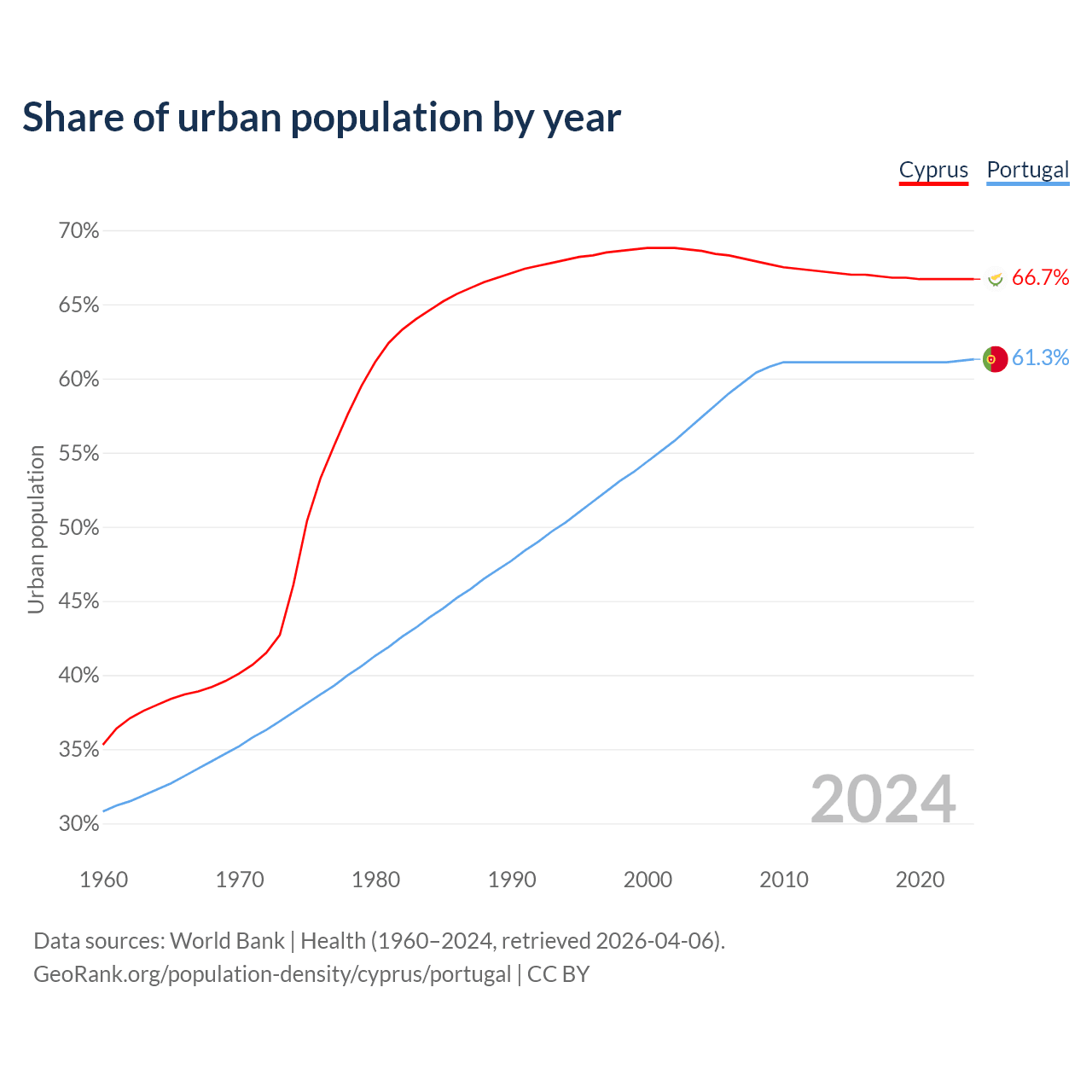 From 2004 to 2024, the share of urban population changed from 68.6% to 66.7% in Cyprus and from 57.4% to 61.3% in Portugal.