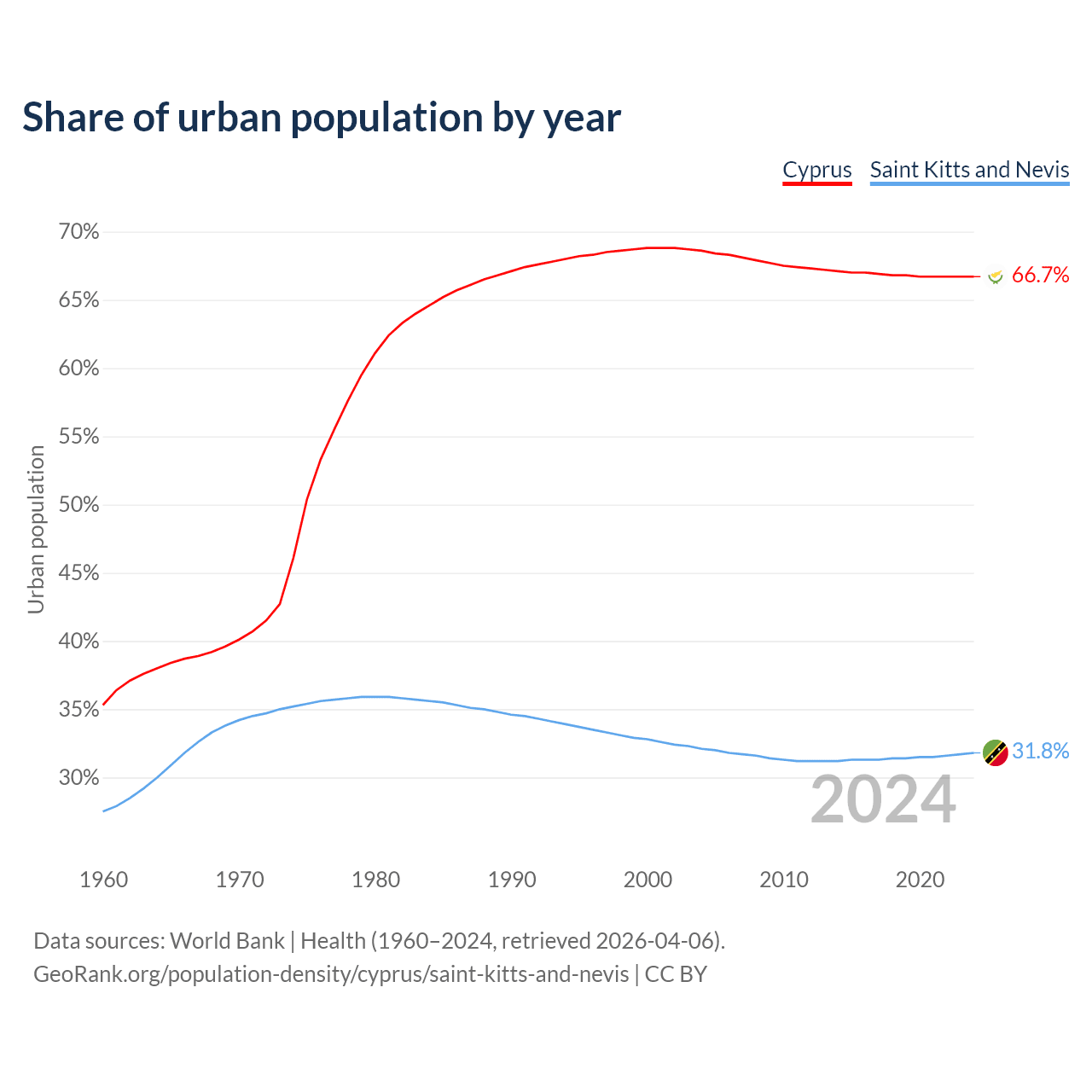 From 2004 to 2024, the share of urban population changed from 68.6% to 66.7% in Cyprus and from 32.1% to 31.8% in Saint Kitts and Nevis.