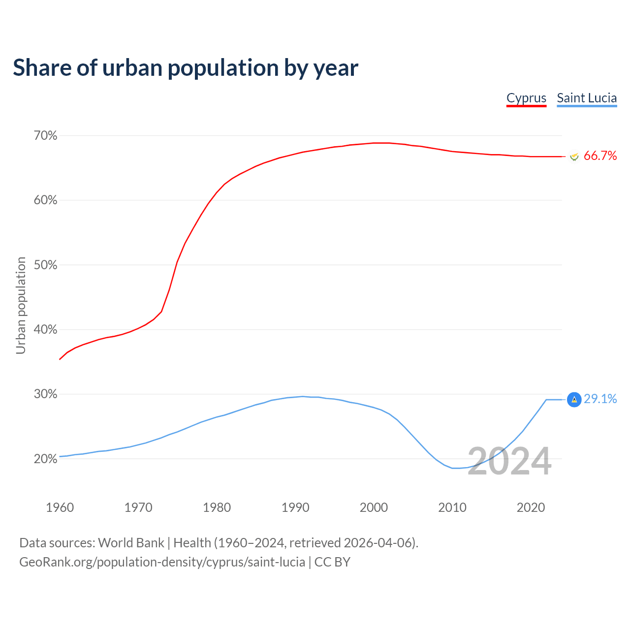 From 2004 to 2024, the share of urban population changed from 68.6% to 66.7% in Cyprus and from 24.8% to 29.1% in Saint Lucia.