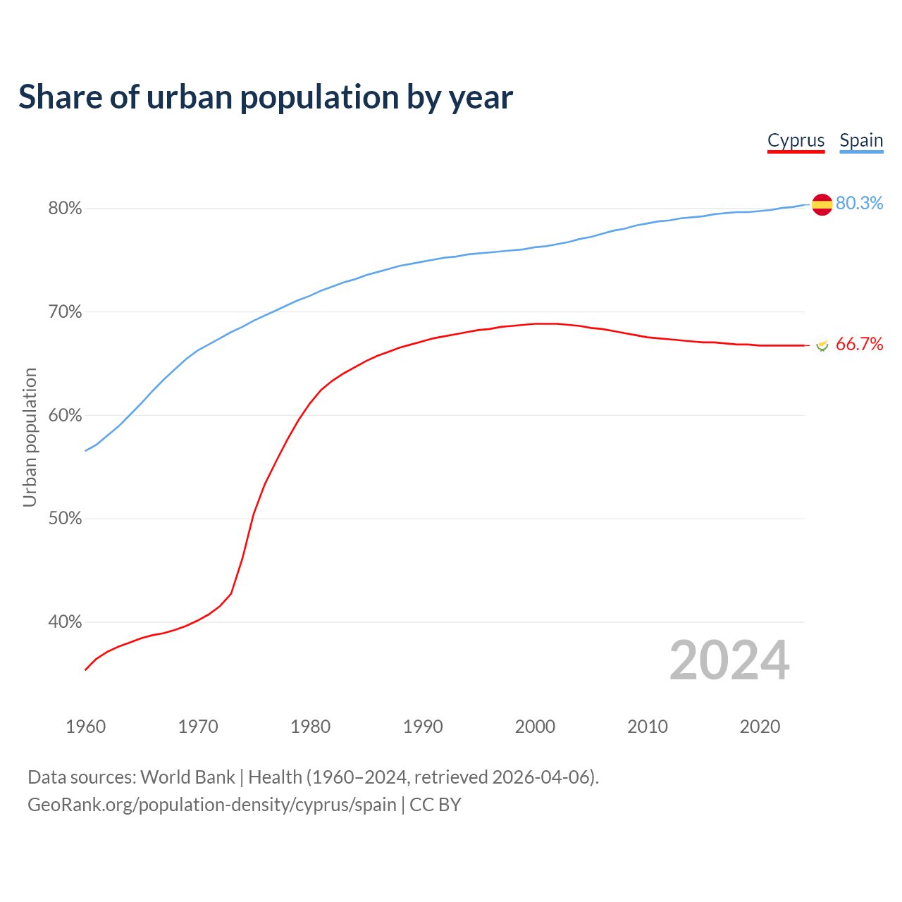 From 2004 to 2024, the share of urban population changed from 68.6% to 66.7% in Cyprus and from 77% to 80.3% in Spain.