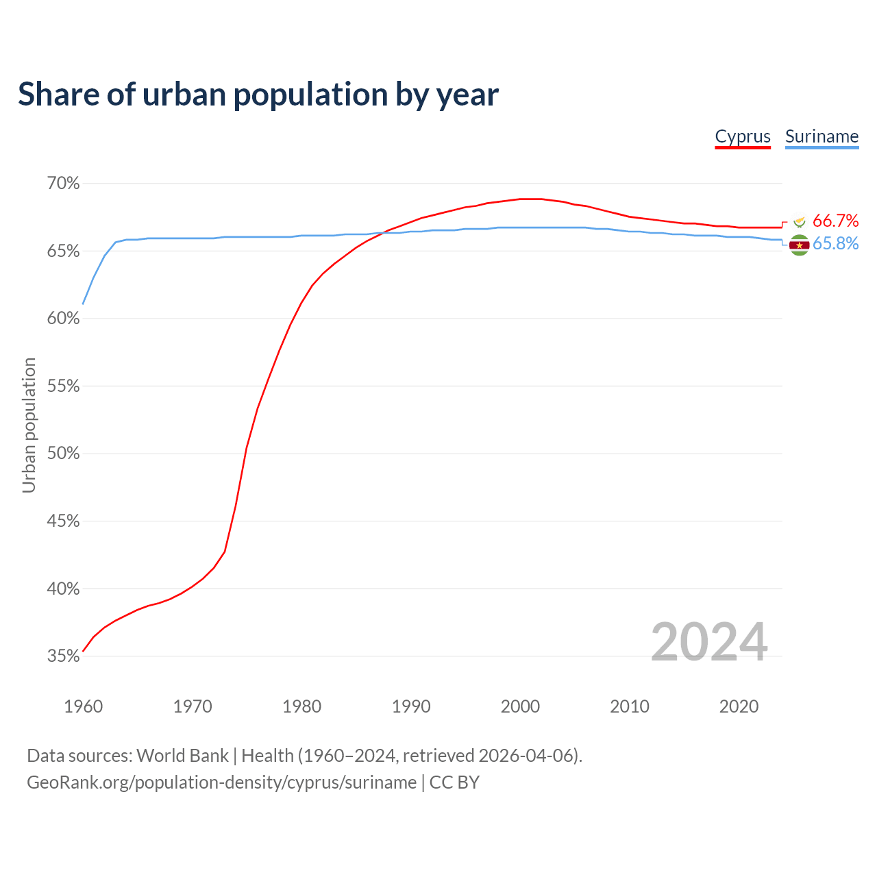 From 2004 to 2024, the share of urban population changed from 68.6% to 66.7% in Cyprus and from 66.7% to 65.8% in Suriname.