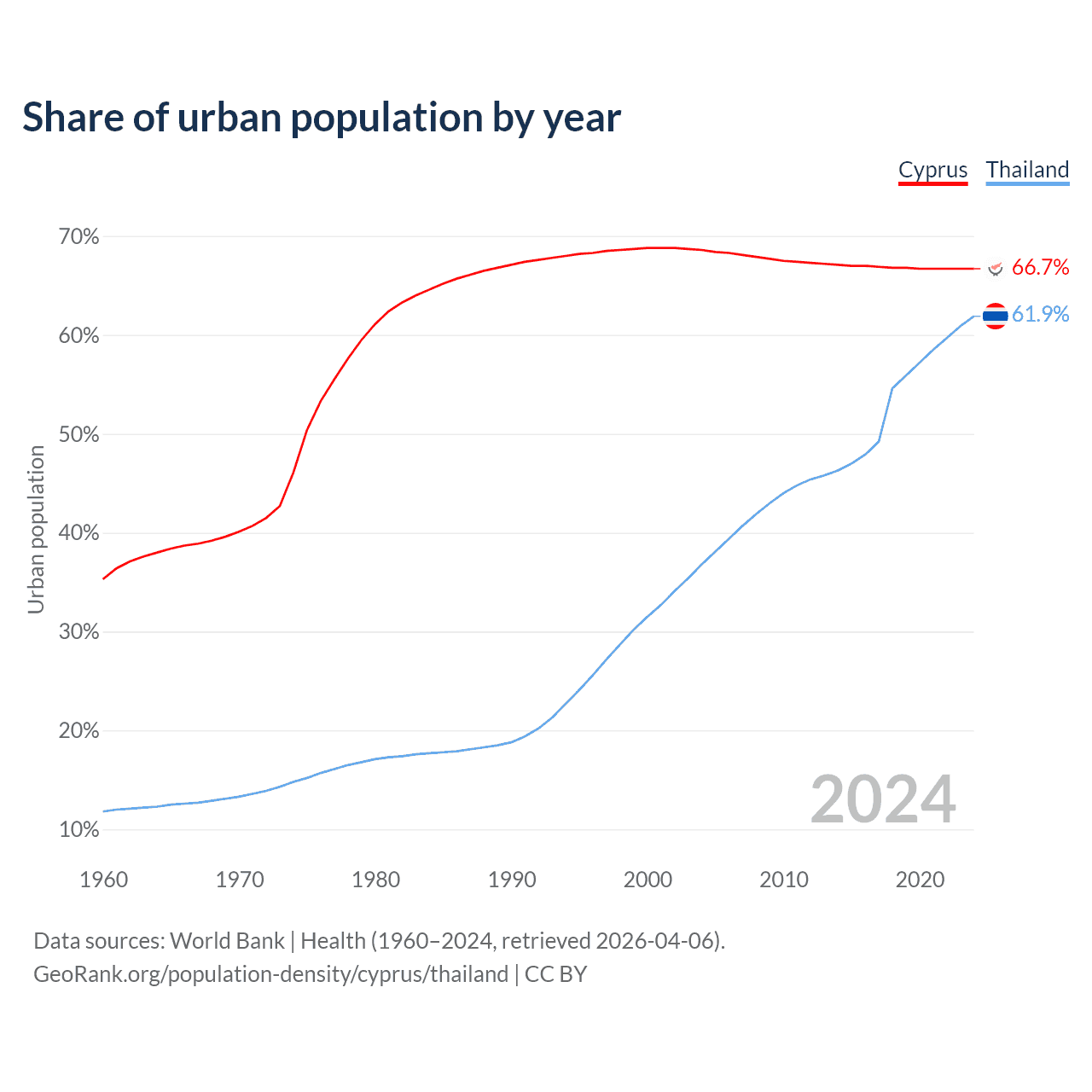 From 2004 to 2024, the share of urban population changed from 68.6% to 66.7% in Cyprus and from 36.8% to 61.9% in Thailand.