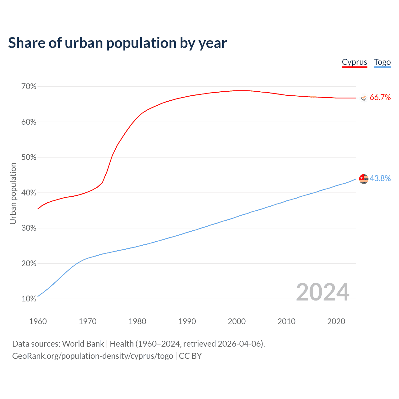 From 2004 to 2024, the share of urban population changed from 68.6% to 66.7% in Cyprus and from 34.9% to 43.8% in Togo.