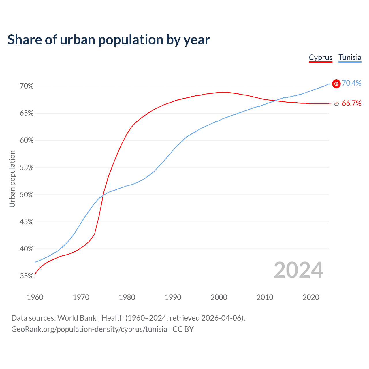 From 2004 to 2024, the share of urban population changed from 68.6% to 66.7% in Cyprus and from 64.9% to 70.4% in Tunisia.