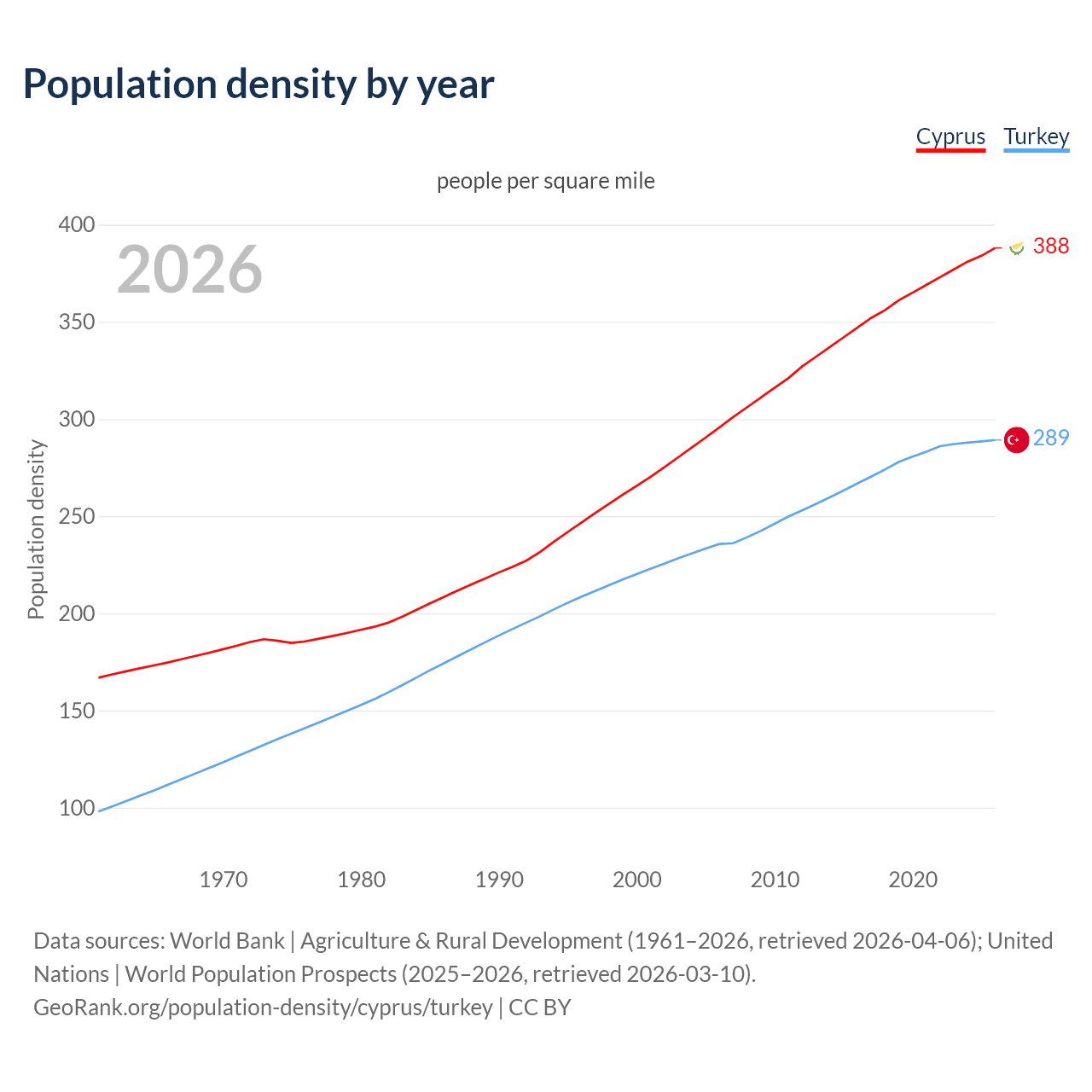From 2006 to 2026, population density in Cyprus increased by 31.2%, compared to a 22.7% growth in Turkey.
