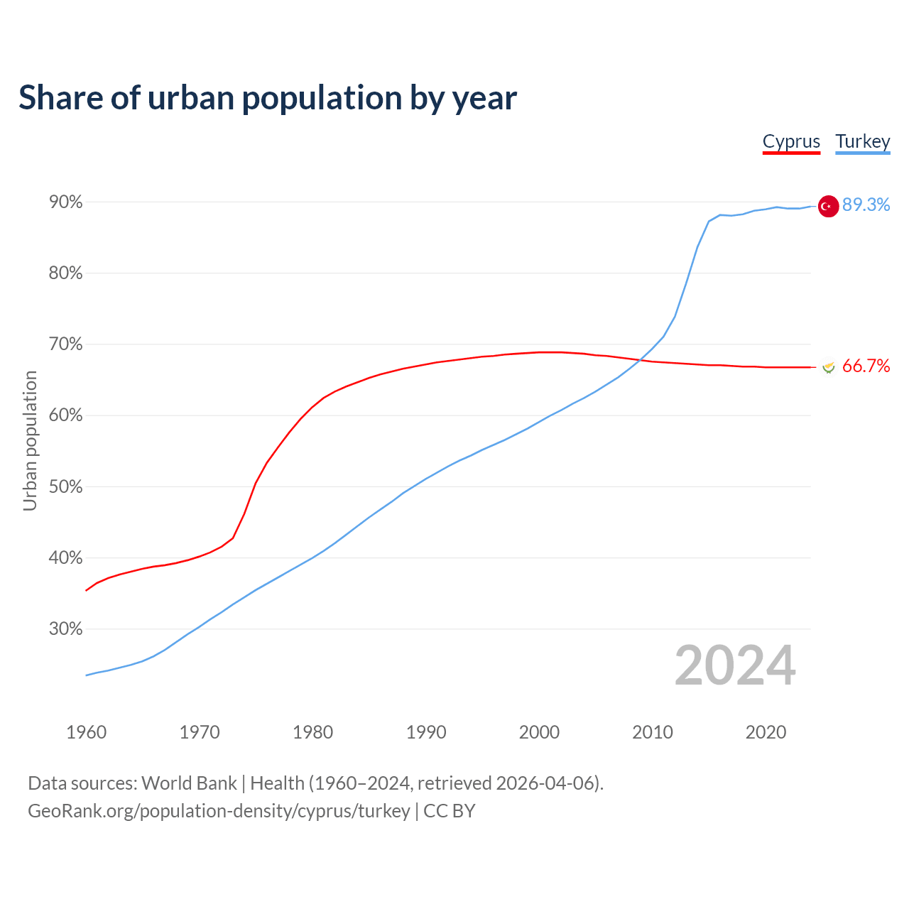 From 2004 to 2024, the share of urban population changed from 68.6% to 66.7% in Cyprus and from 62.4% to 89.3% in Turkey.
