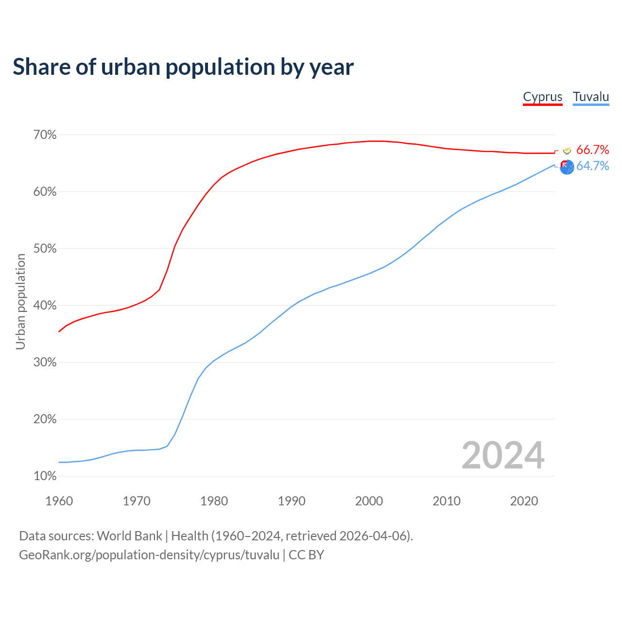 From 2004 to 2024, the share of urban population changed from 68.6% to 66.7% in Cyprus and from 48.4% to 64.7% in Tuvalu.