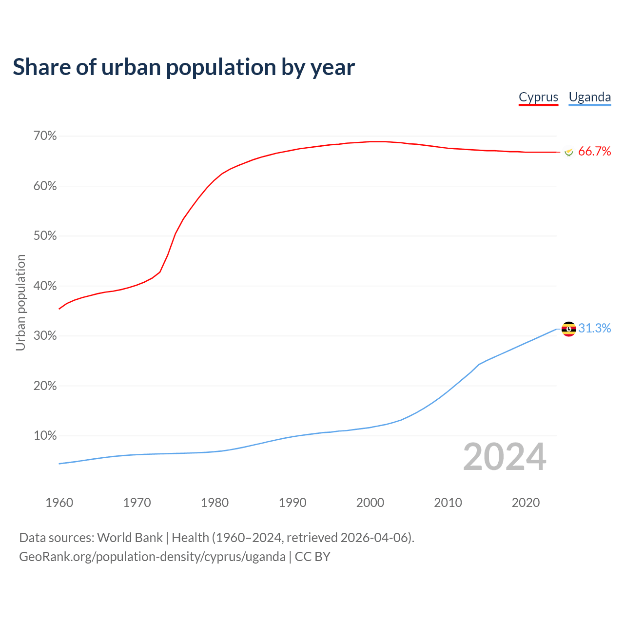 From 2004 to 2024, the share of urban population changed from 68.6% to 66.7% in Cyprus and from 13.1% to 31.3% in Uganda.