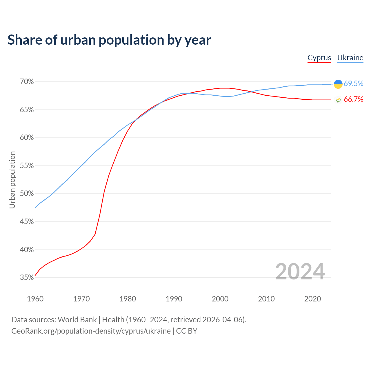 From 2004 to 2024, the share of urban population changed from 68.6% to 66.7% in Cyprus and from 67.6% to 69.5% in Ukraine.