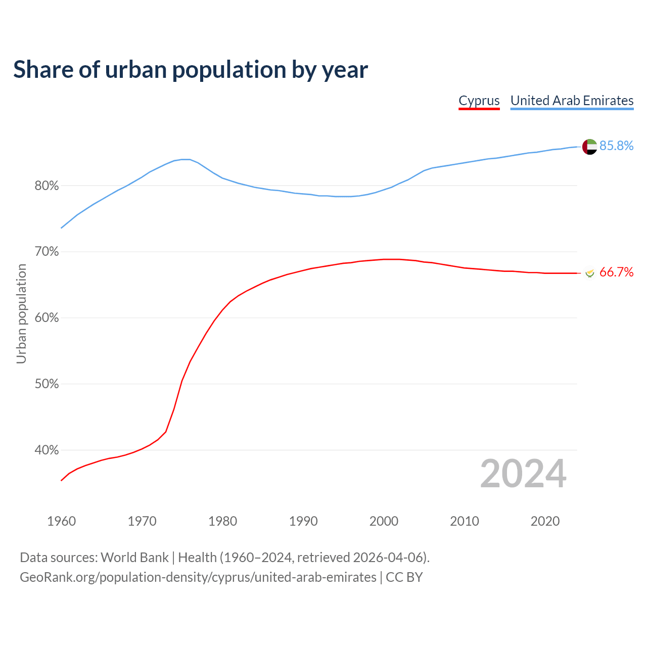 From 2004 to 2024, the share of urban population changed from 68.6% to 66.7% in Cyprus and from 81.5% to 85.8% in the United Arab Emirates.