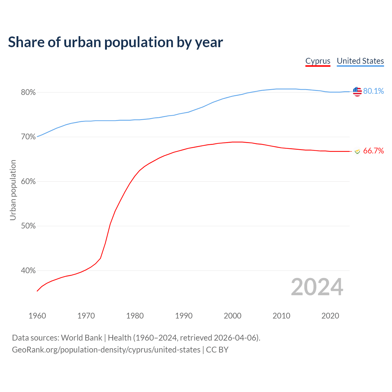 From 2004 to 2024, the share of urban population changed from 68.6% to 66.7% in Cyprus and from 80% to 80.1% in the United States.