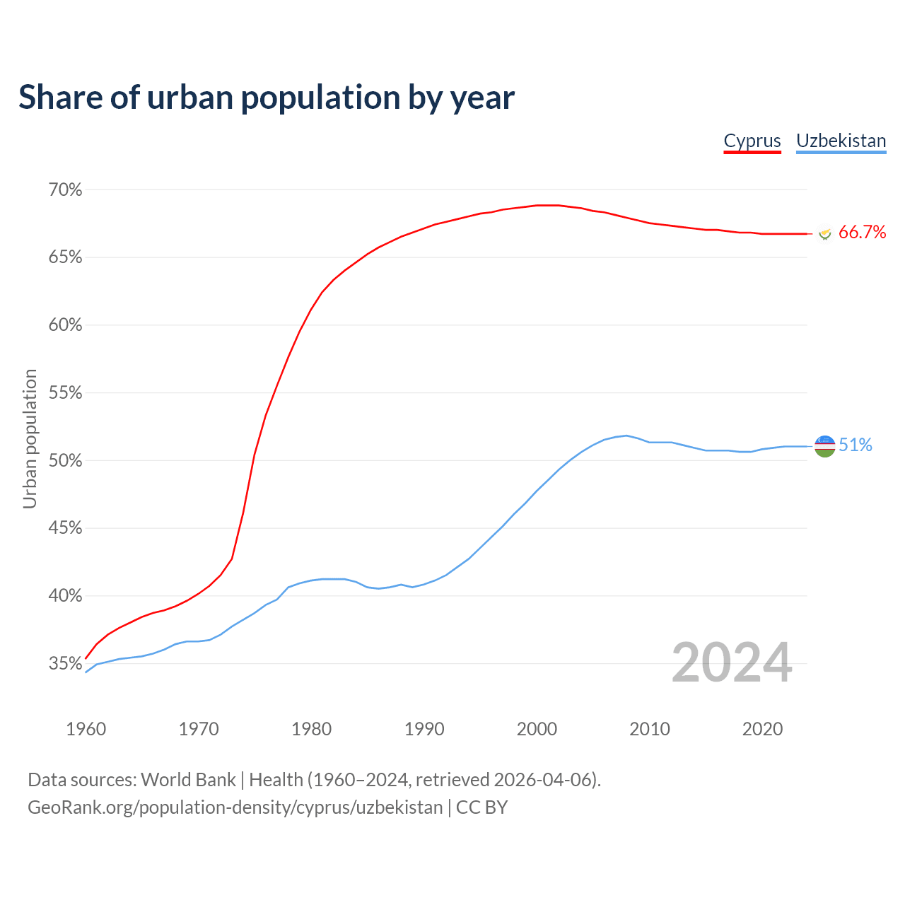 From 2004 to 2024, the share of urban population changed from 68.6% to 66.7% in Cyprus and from 50.6% to 51% in Uzbekistan.