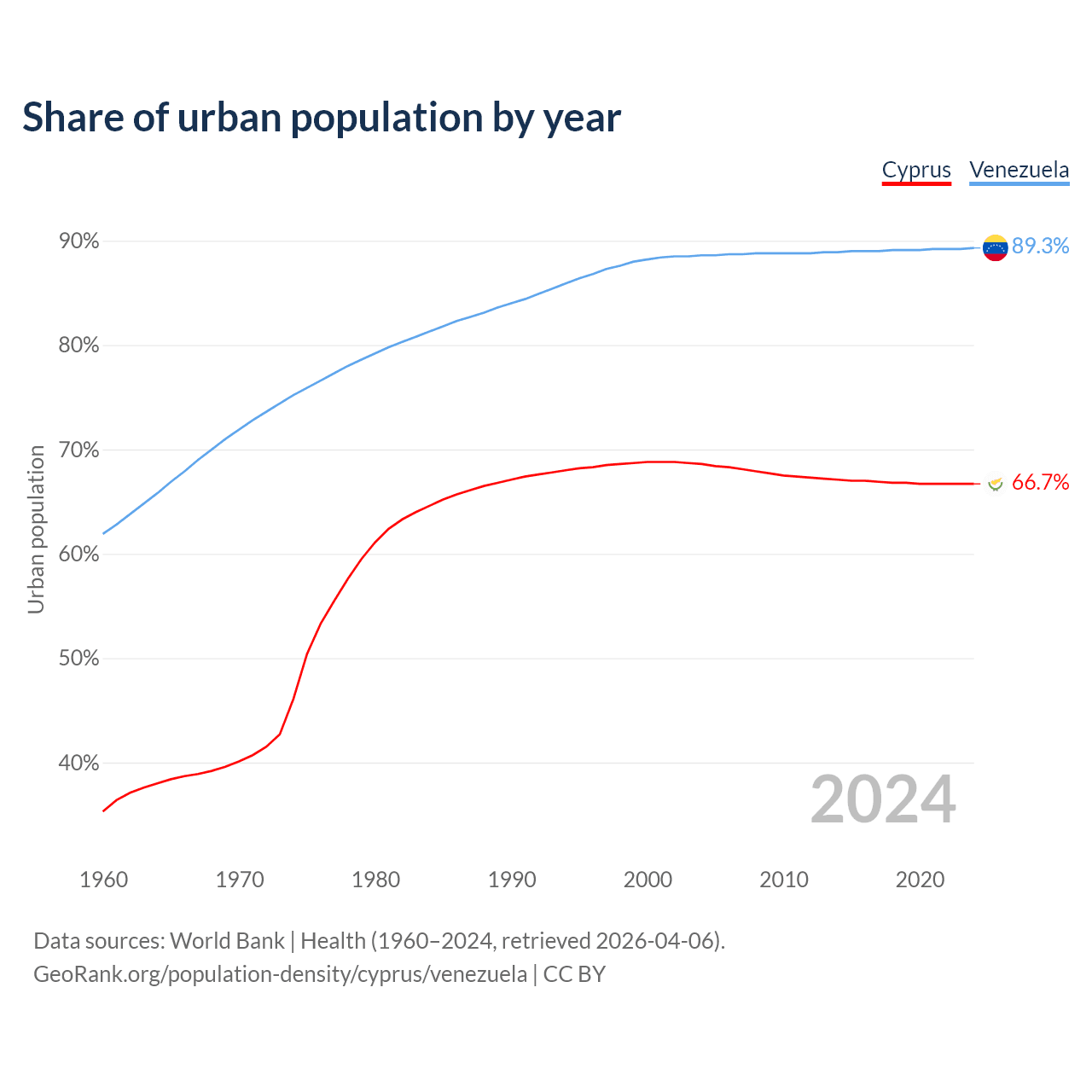 From 2004 to 2024, the share of urban population changed from 68.6% to 66.7% in Cyprus and from 88.6% to 89.3% in Venezuela.