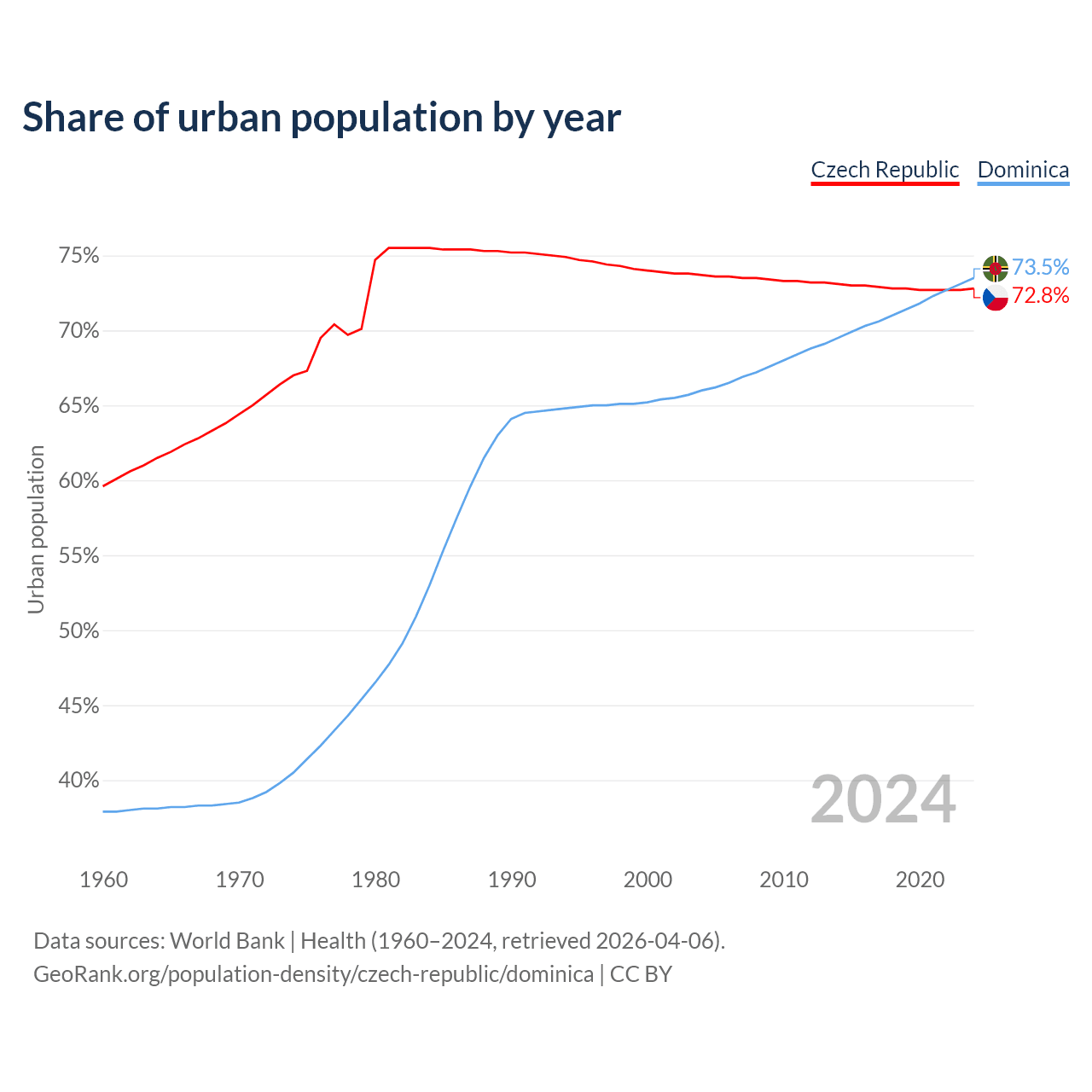 From 2004 to 2024, the share of urban population changed from 73.7% to 72.8% in the Czech Republic and from 66% to 73.5% in Dominica.