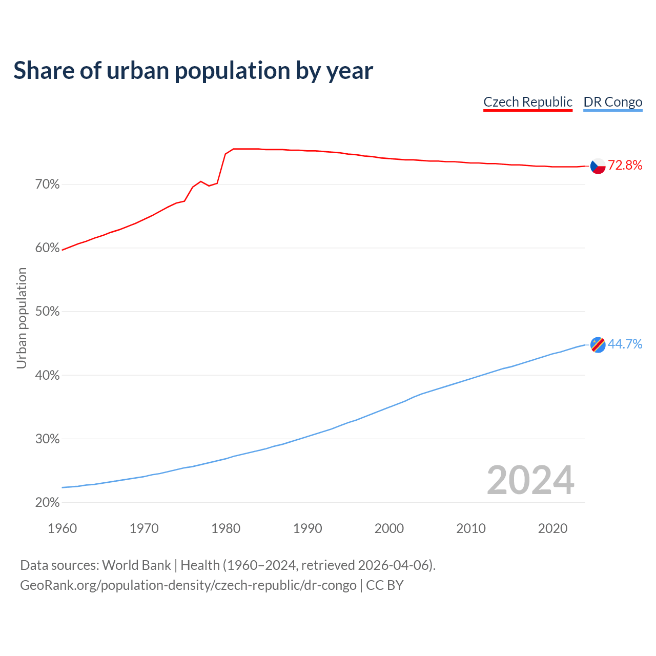 From 2004 to 2024, the share of urban population changed from 73.7% to 72.8% in the Czech Republic and from 37% to 44.7% in the DR Congo.