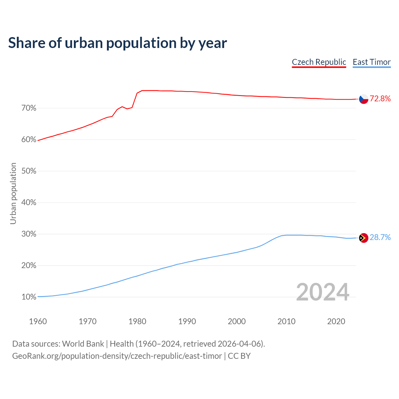 From 2004 to 2024, the share of urban population changed from 73.7% to 72.8% in the Czech Republic and from 25.7% to 28.7% in East Timor.