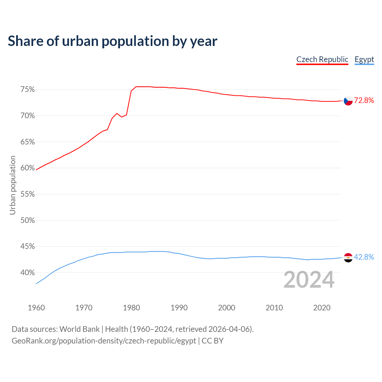From 2004 to 2024, the share of urban population changed from 73.7% to 72.8% in the Czech Republic and from 42.9% to 42.8% in Egypt.
