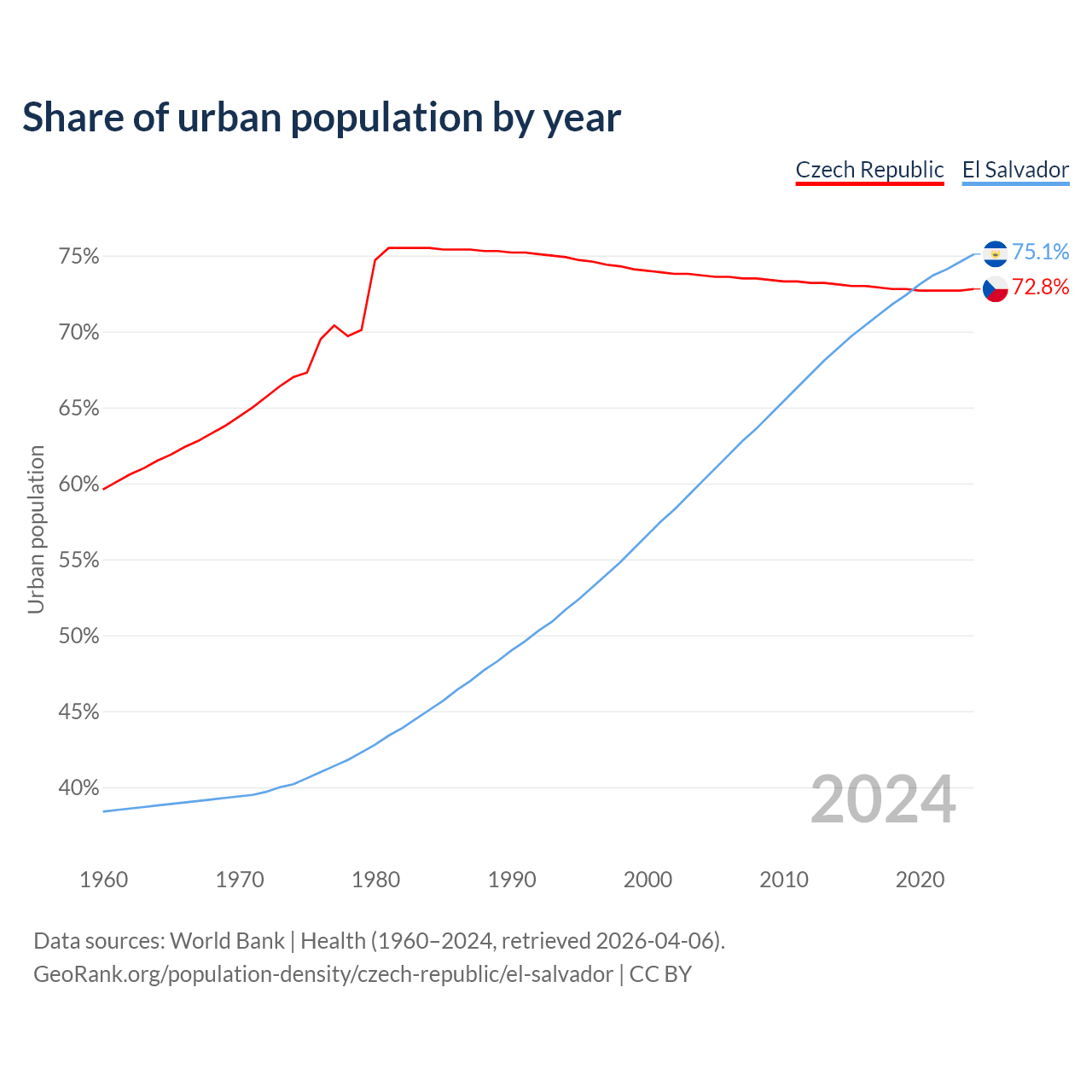 From 2004 to 2024, the share of urban population changed from 73.7% to 72.8% in the Czech Republic and from 60.1% to 75.1% in El Salvador.