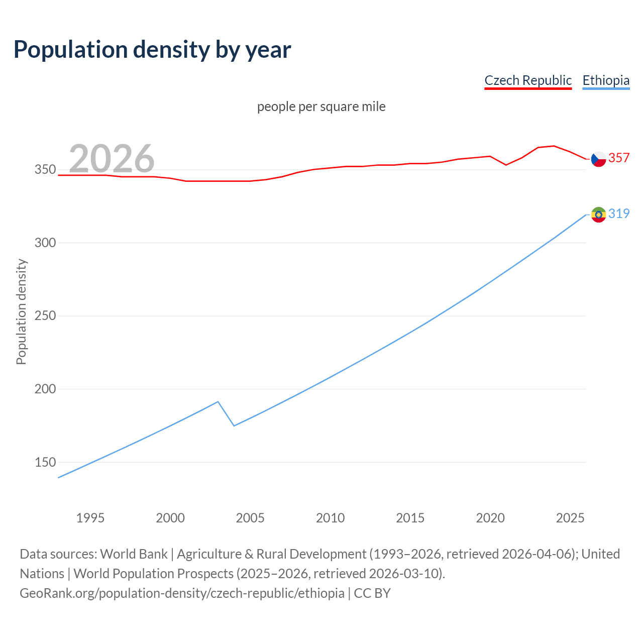 The Czech Republic has a population density of 357 people per square mile compared to 319 people in Ethiopia. The Czech Republic has 77,850 sq ft of land per person vs 90,009 sq ft in Ethiopia. The Czech Republic and Ethiopia rank 71st and 78th by population density, respectively.