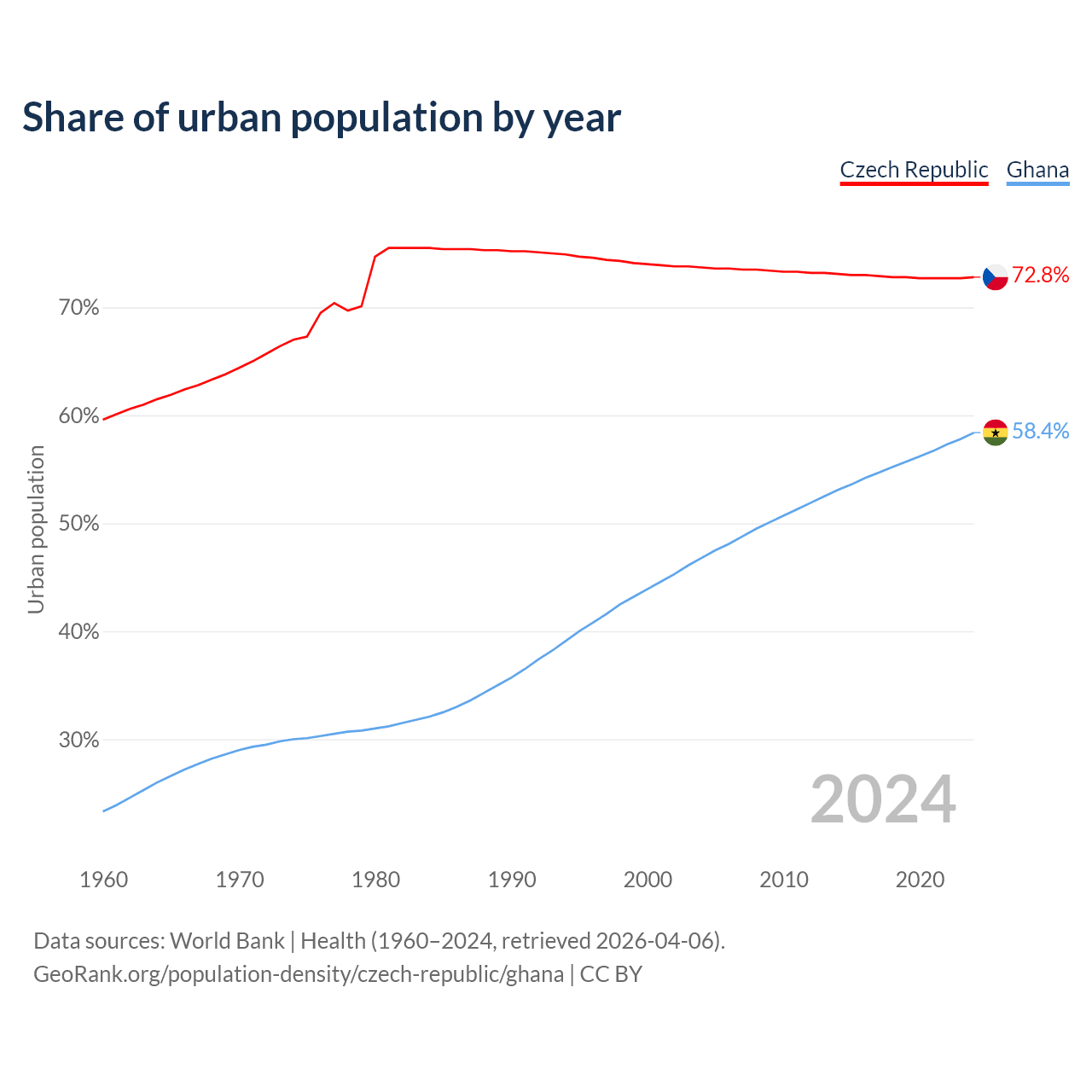 From 2004 to 2024, the share of urban population changed from 73.7% to 72.8% in the Czech Republic and from 46.8% to 58.4% in Ghana.