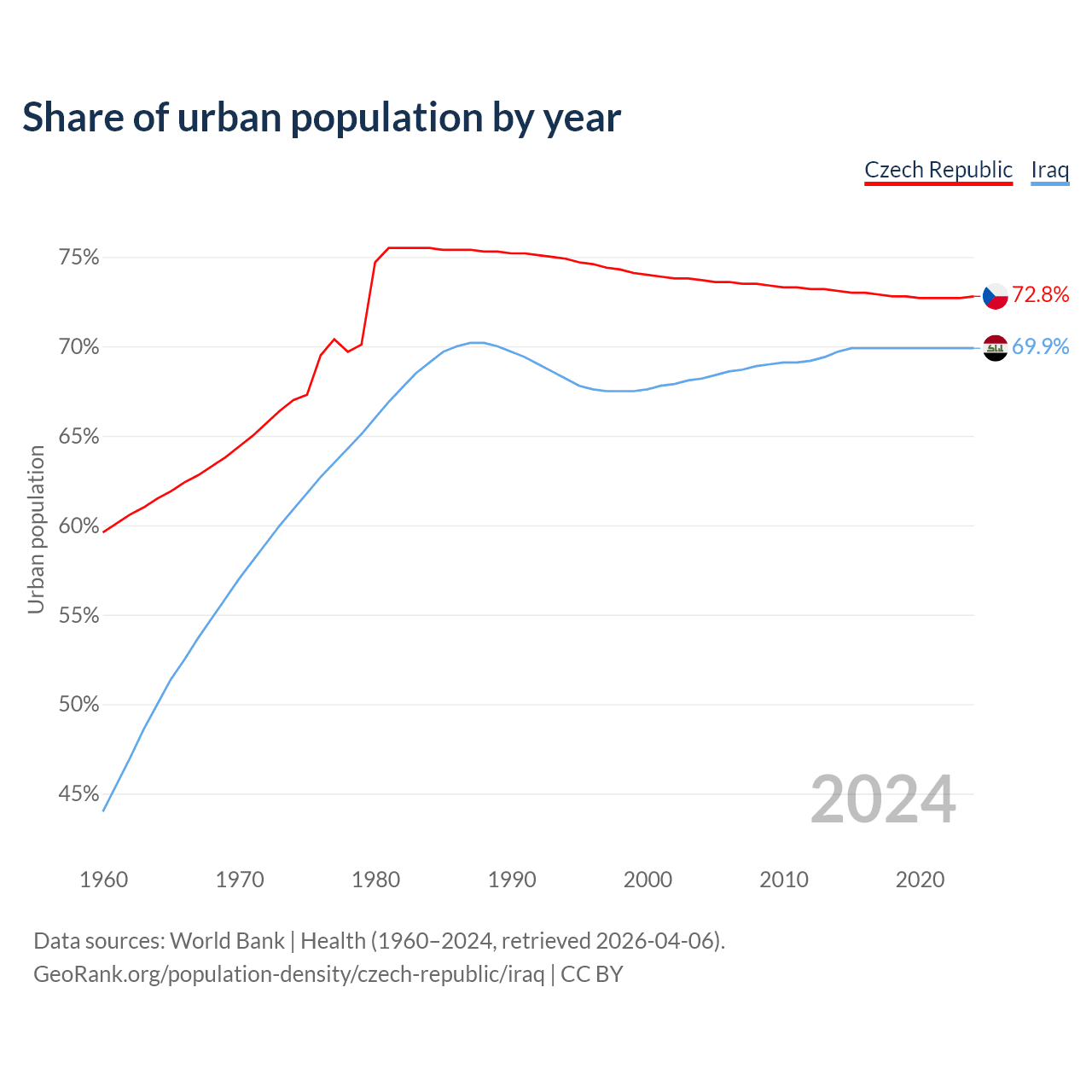 From 2004 to 2024, the share of urban population changed from 73.7% to 72.8% in the Czech Republic and from 68.2% to 69.9% in Iraq.